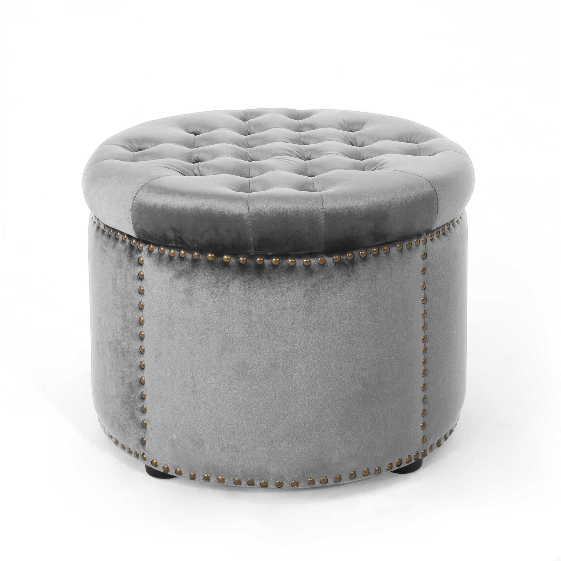 Elegant Round Ottoman Footstool With Velvet Upholstery And Studded Rim - Gray
