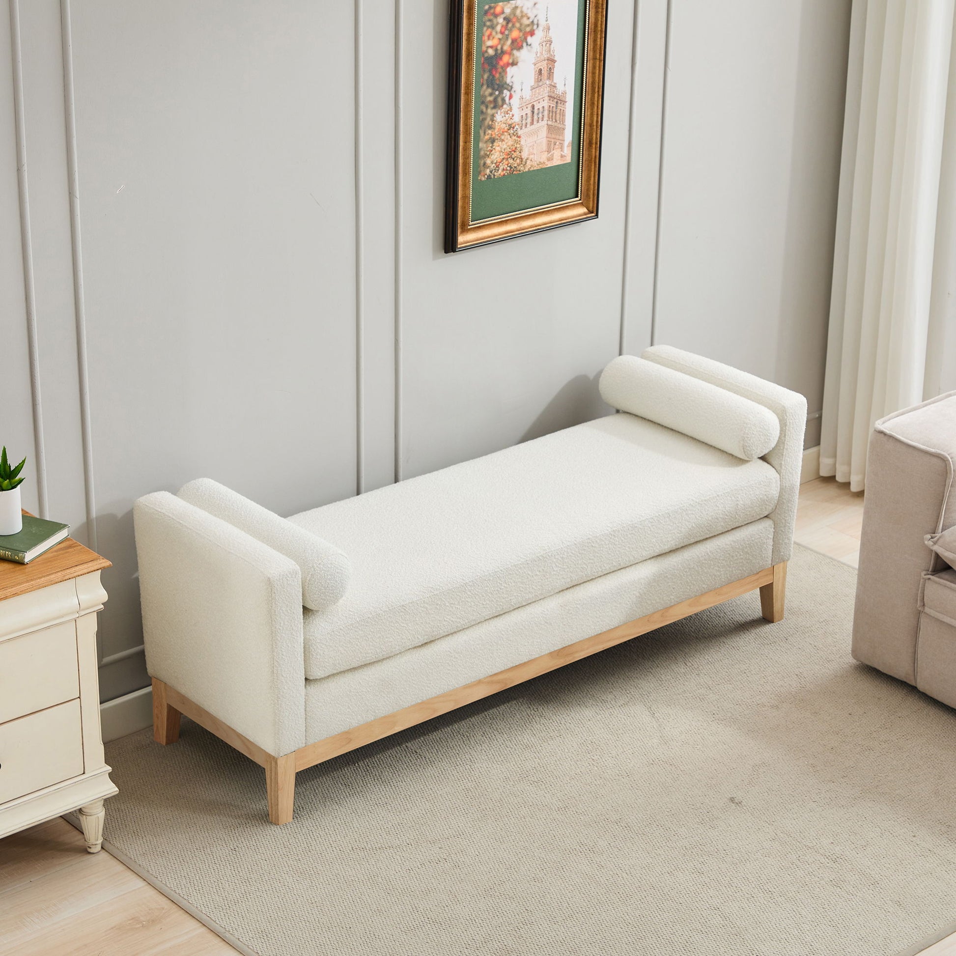 Elegant Upholstered Bench Daybed Ottoman With Nature Wood Legs & Bolster Pillows - Ivory Boucle