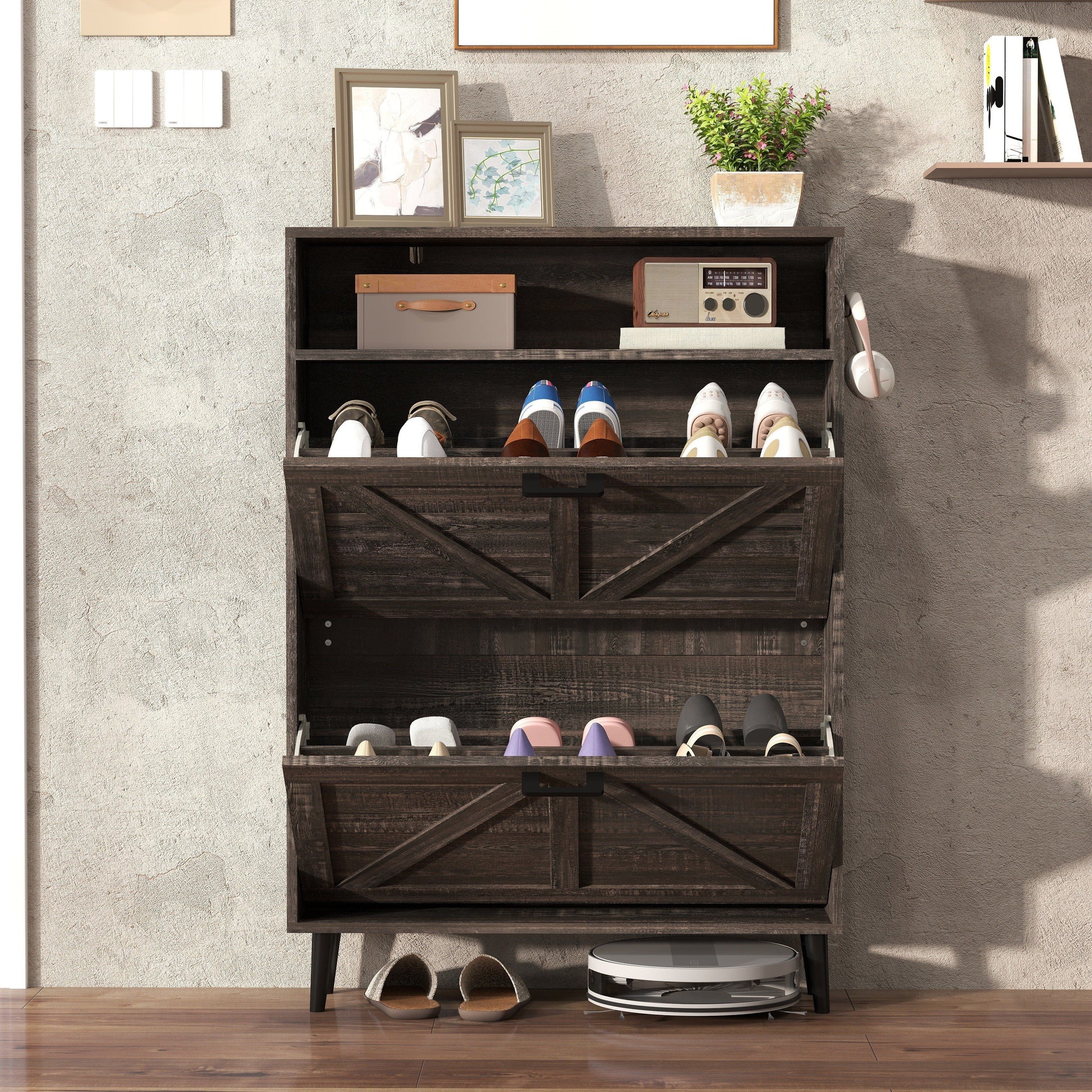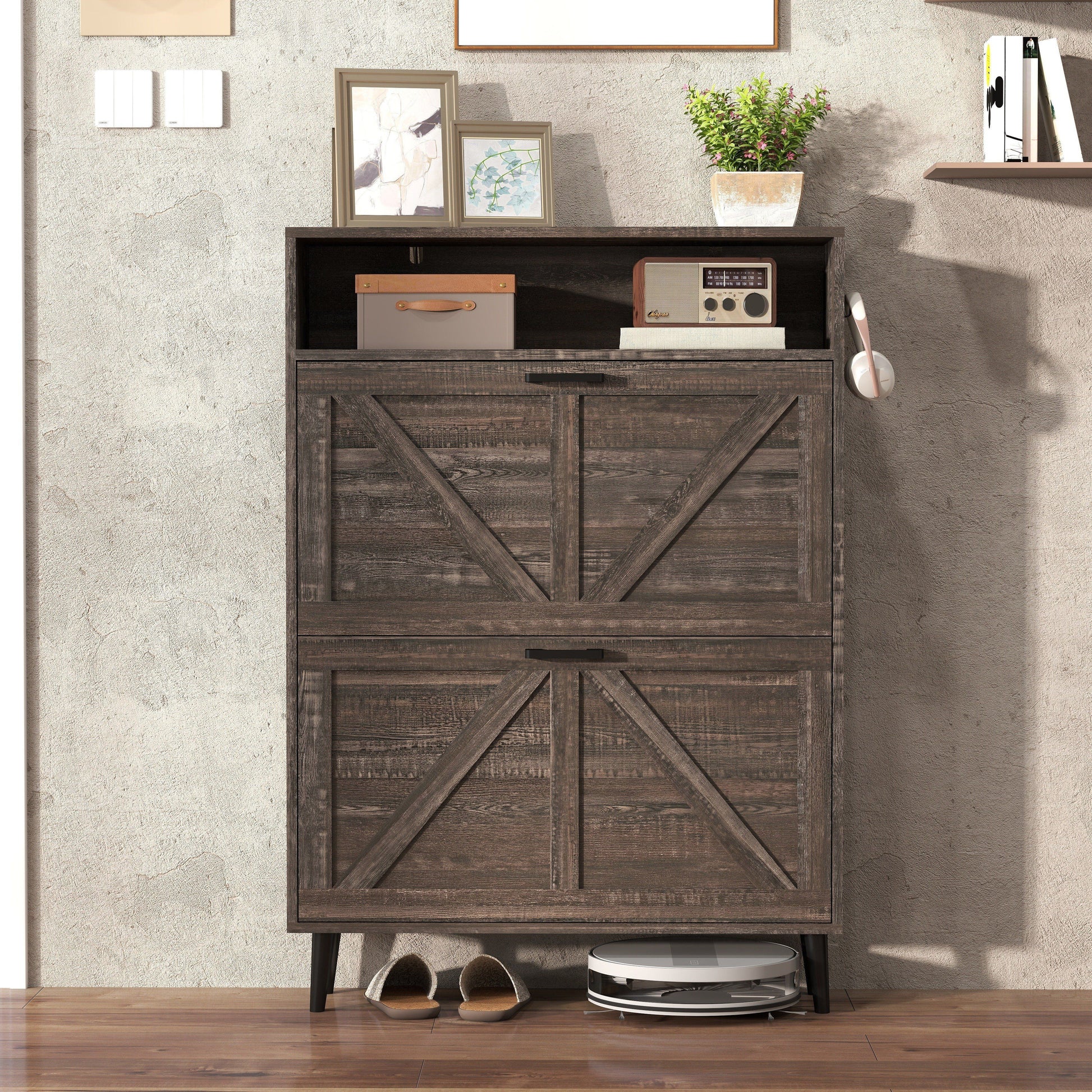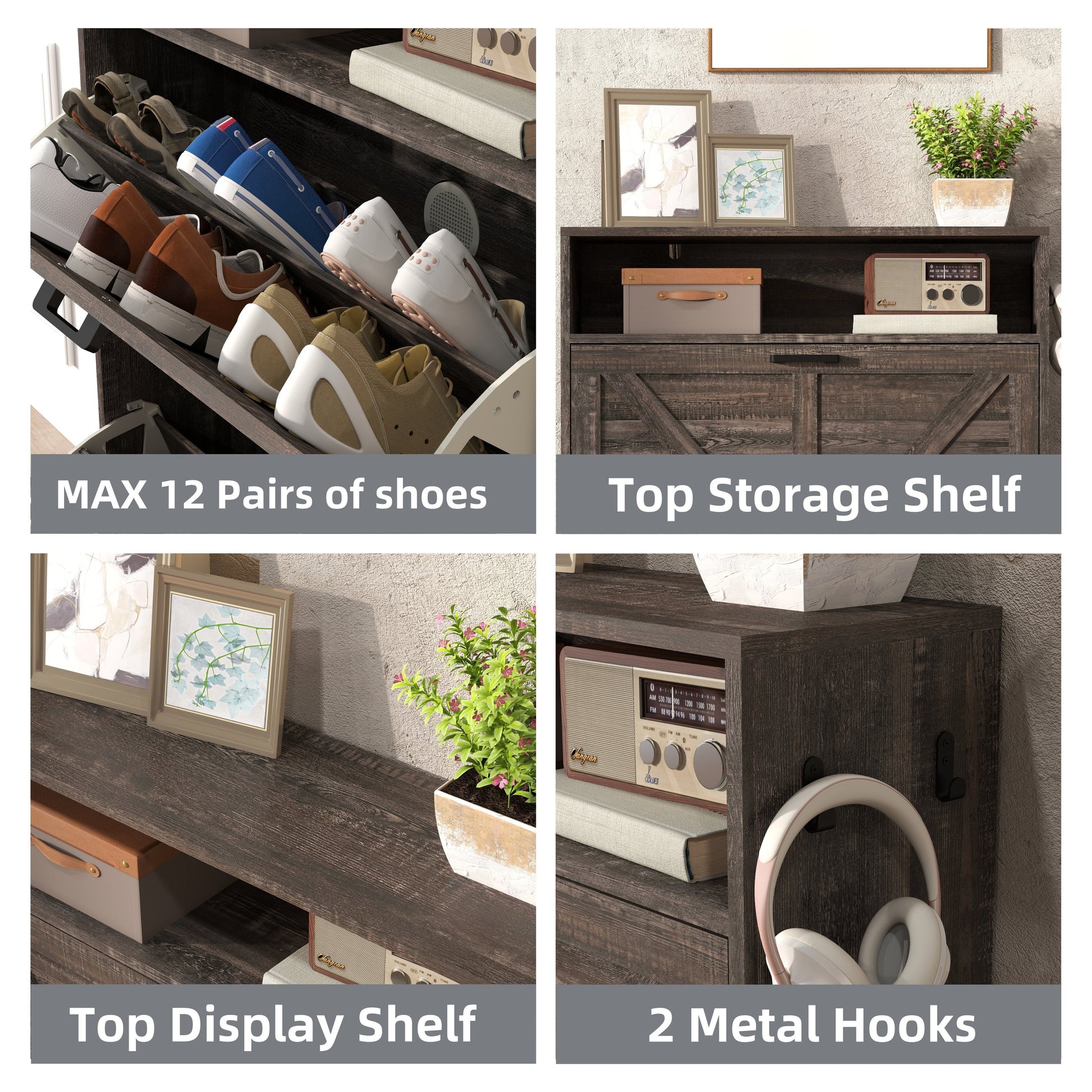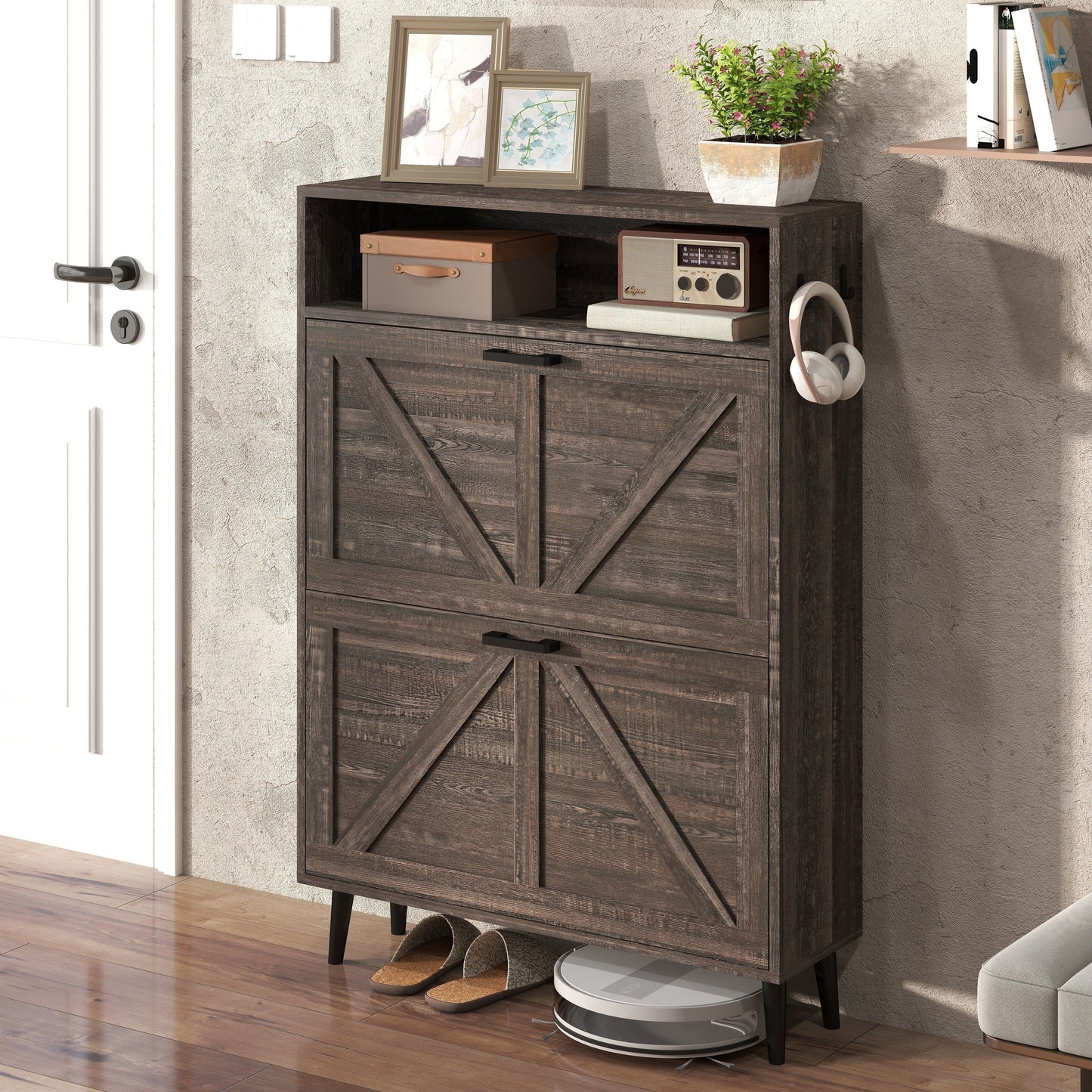 Farmhouse Shoe Storage Cabinet With Barn Door Design, 2 Flip Drawers, Hooks - Dark Oak