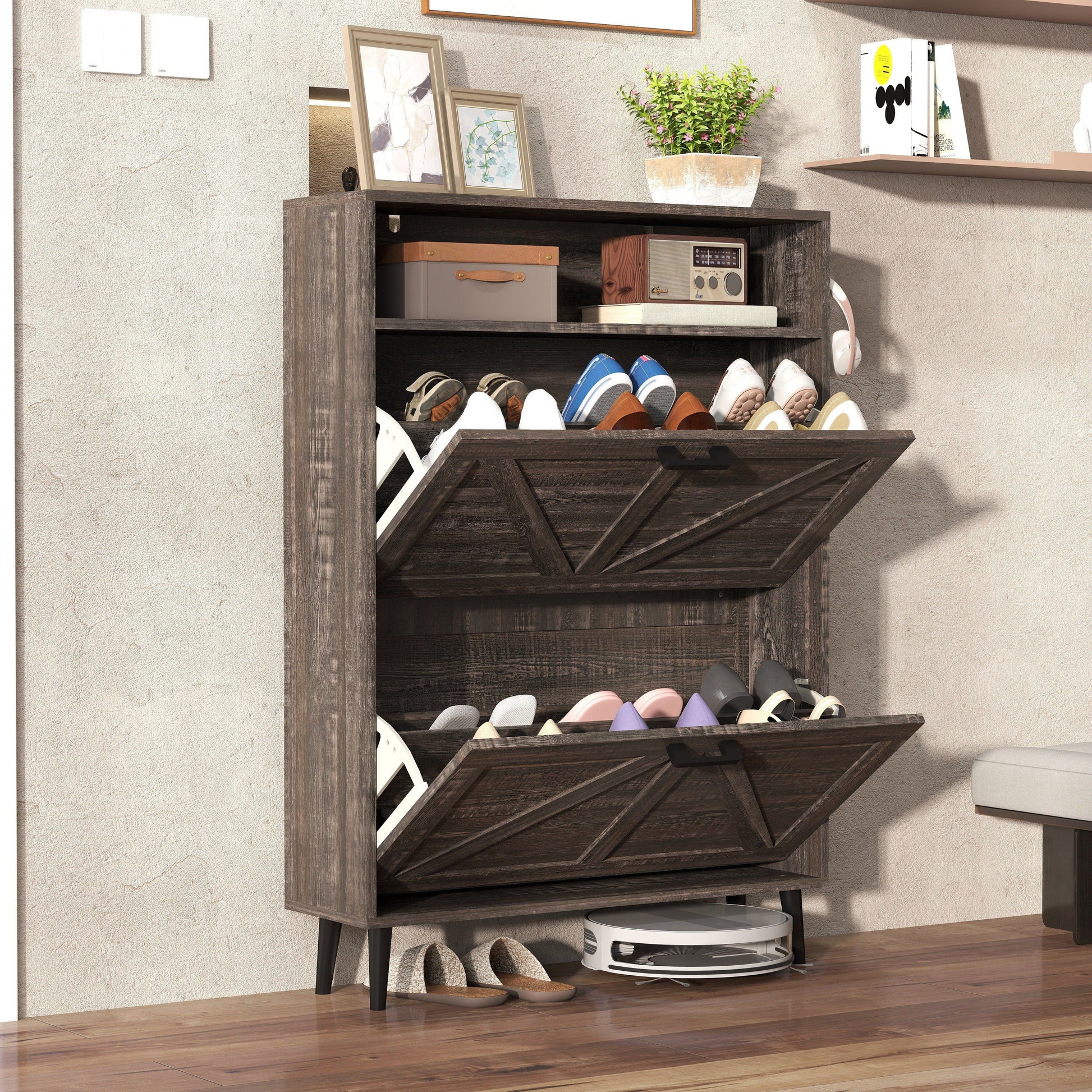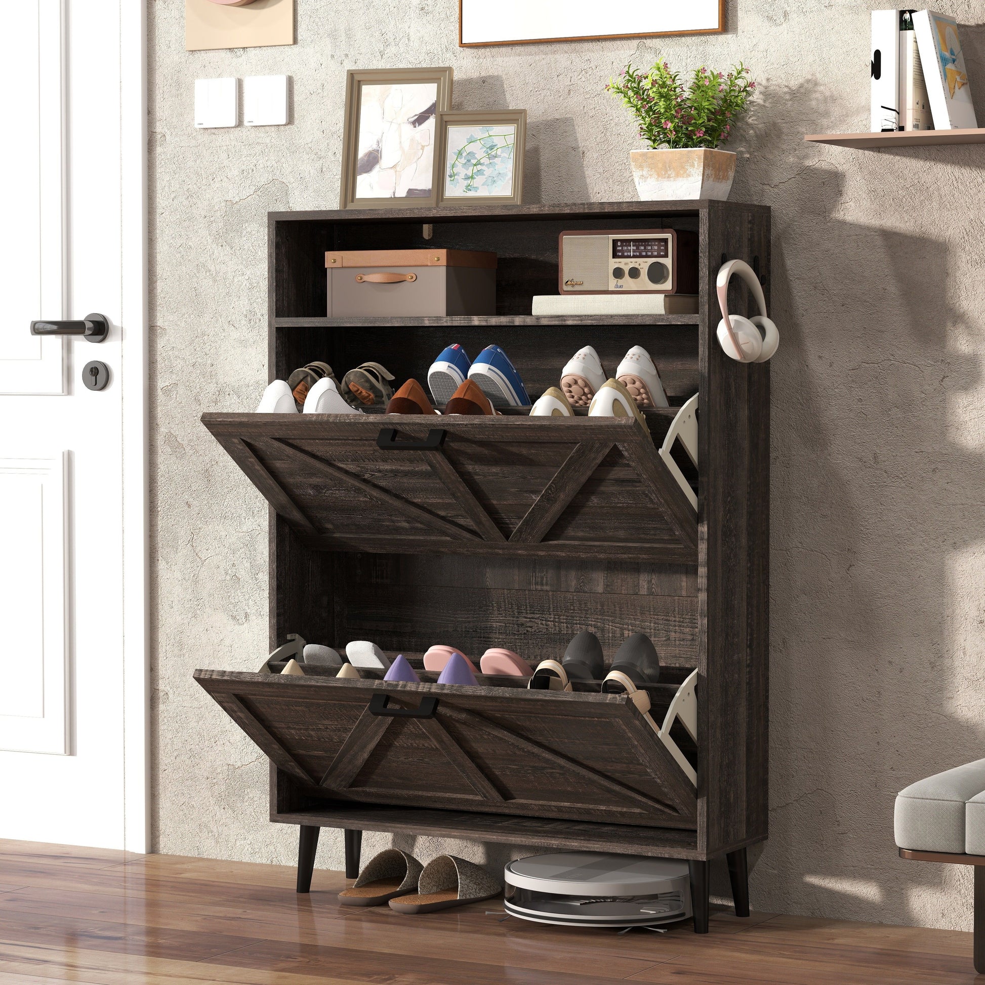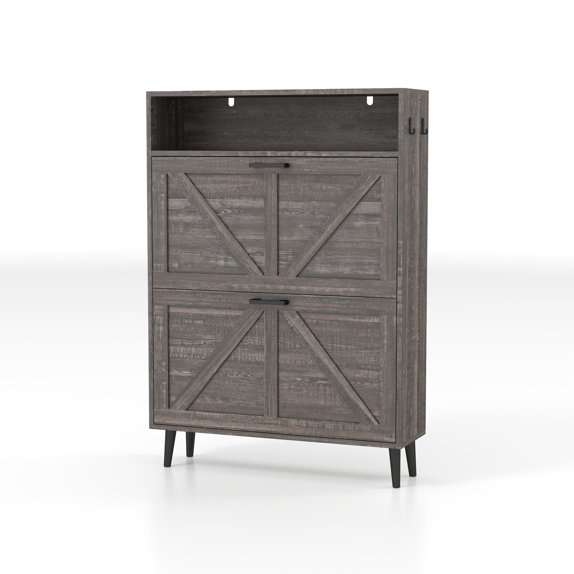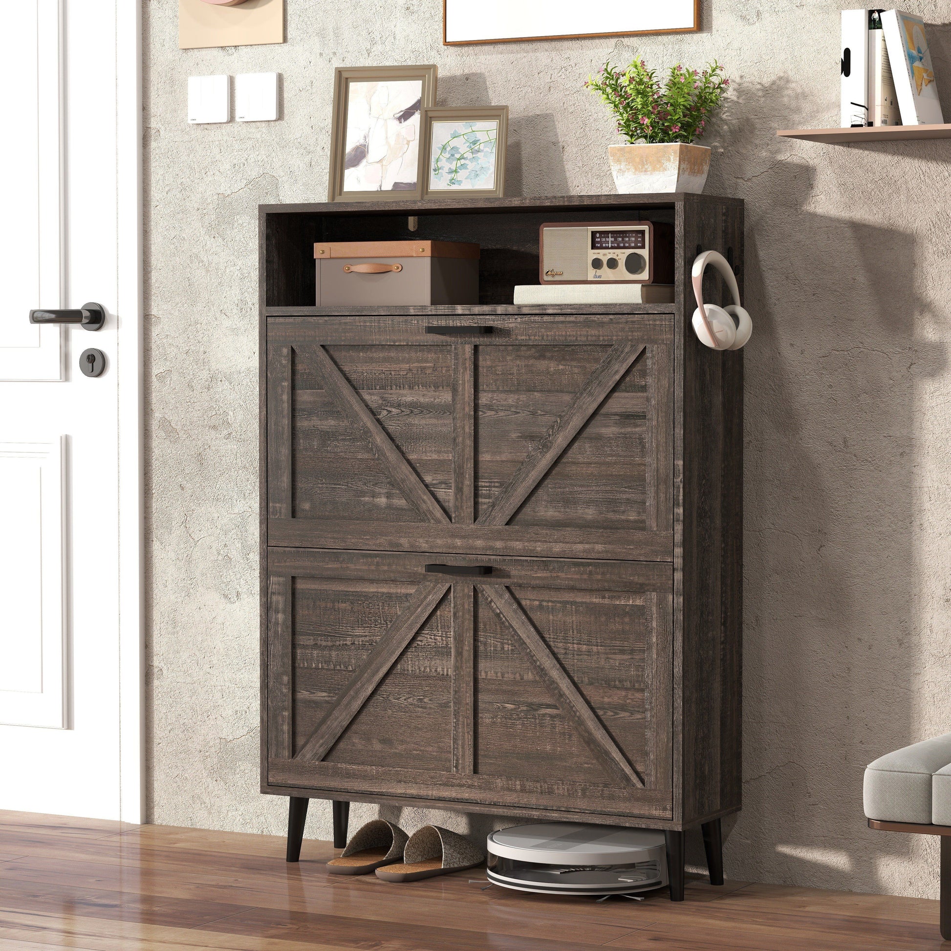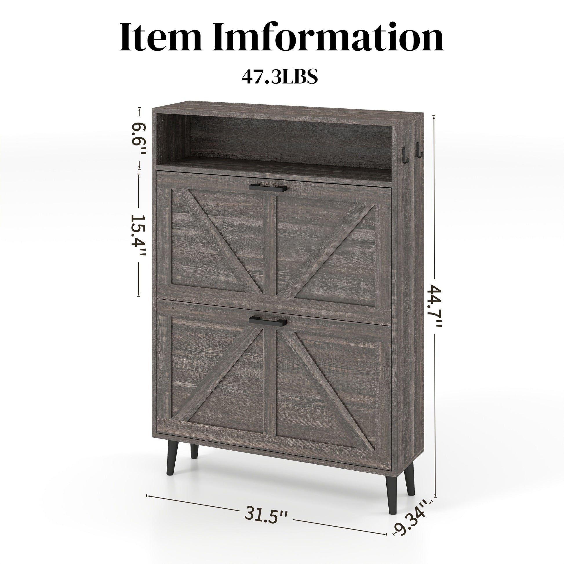Farmhouse Shoe Storage Cabinet With Barn Door Design, 2 Flip Drawers, Hooks - Dark Oak