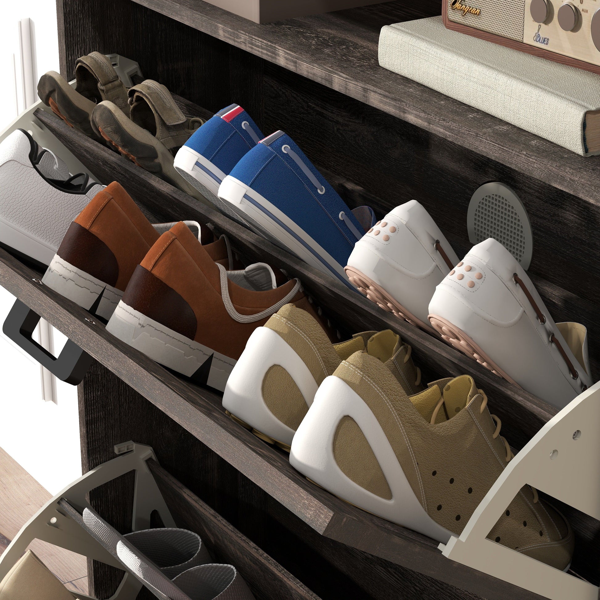 - Ample Storage for 12 Pairs of Shoes: Includes a top surface, compartments, two flip drawers, and a bottom shelf for versatile storage.