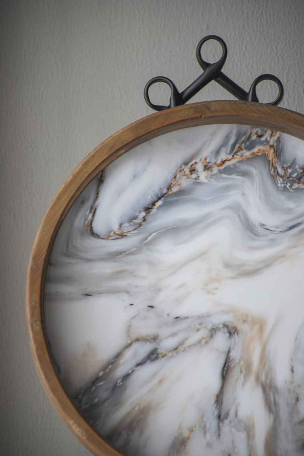 - Variety of Items: Includes a large distressed white side table, wood stool, decorative wooden trays, a vase, and fiddle leaf branches.