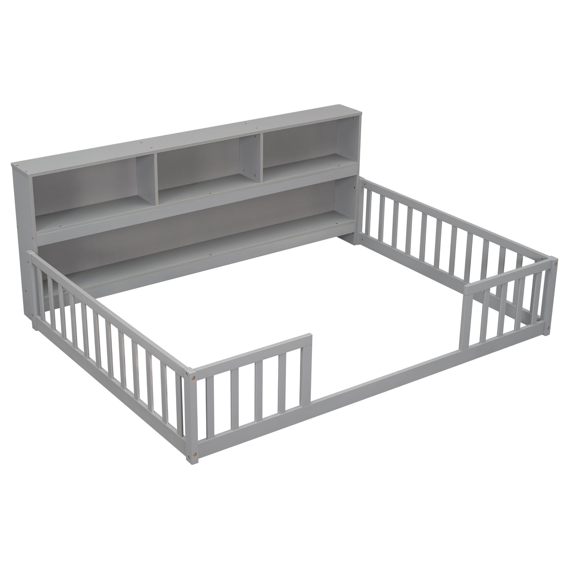 Full Floor Bed With Side Bookcase, Shelves, Guardrails - Gray