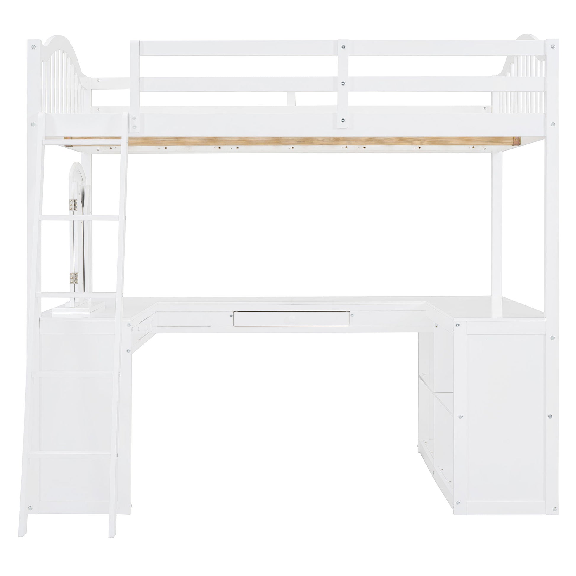 Full Loft Bed With U Shaped Desk, Storage Compartments And Tri Fold Mirror - White