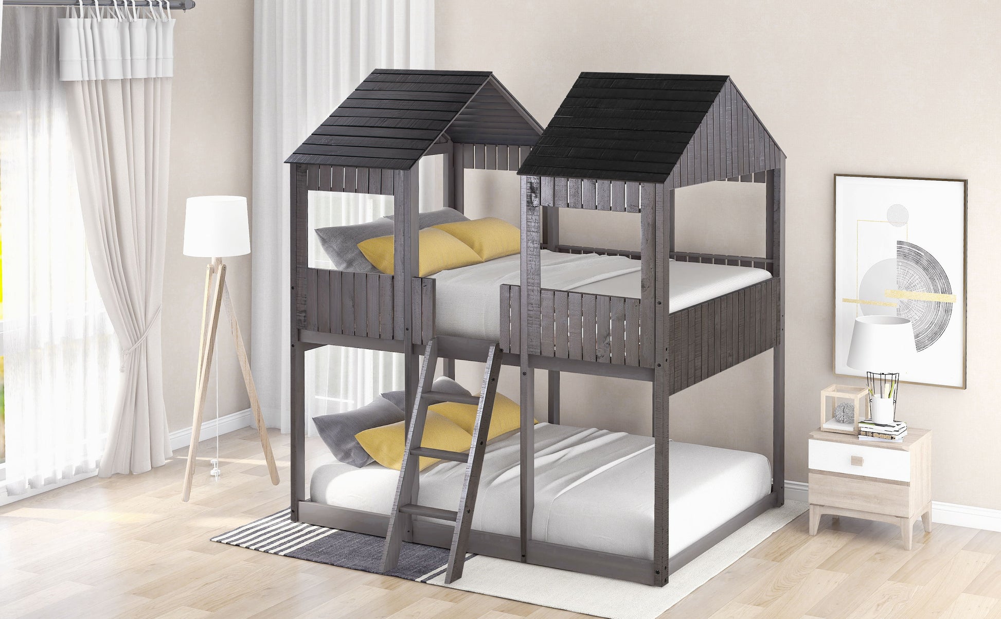 Full Over Full Bunk Bed With Roof, Window, Guardrail, Ladder - Antique Gray