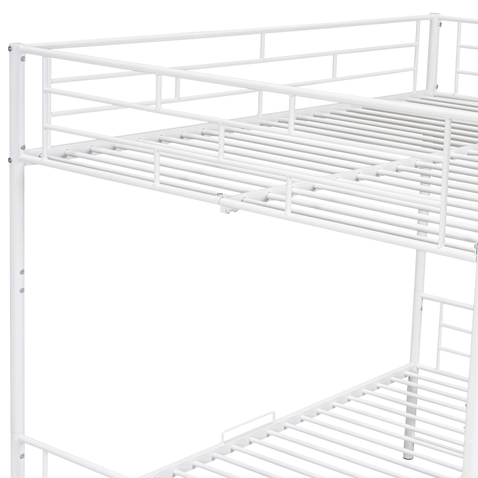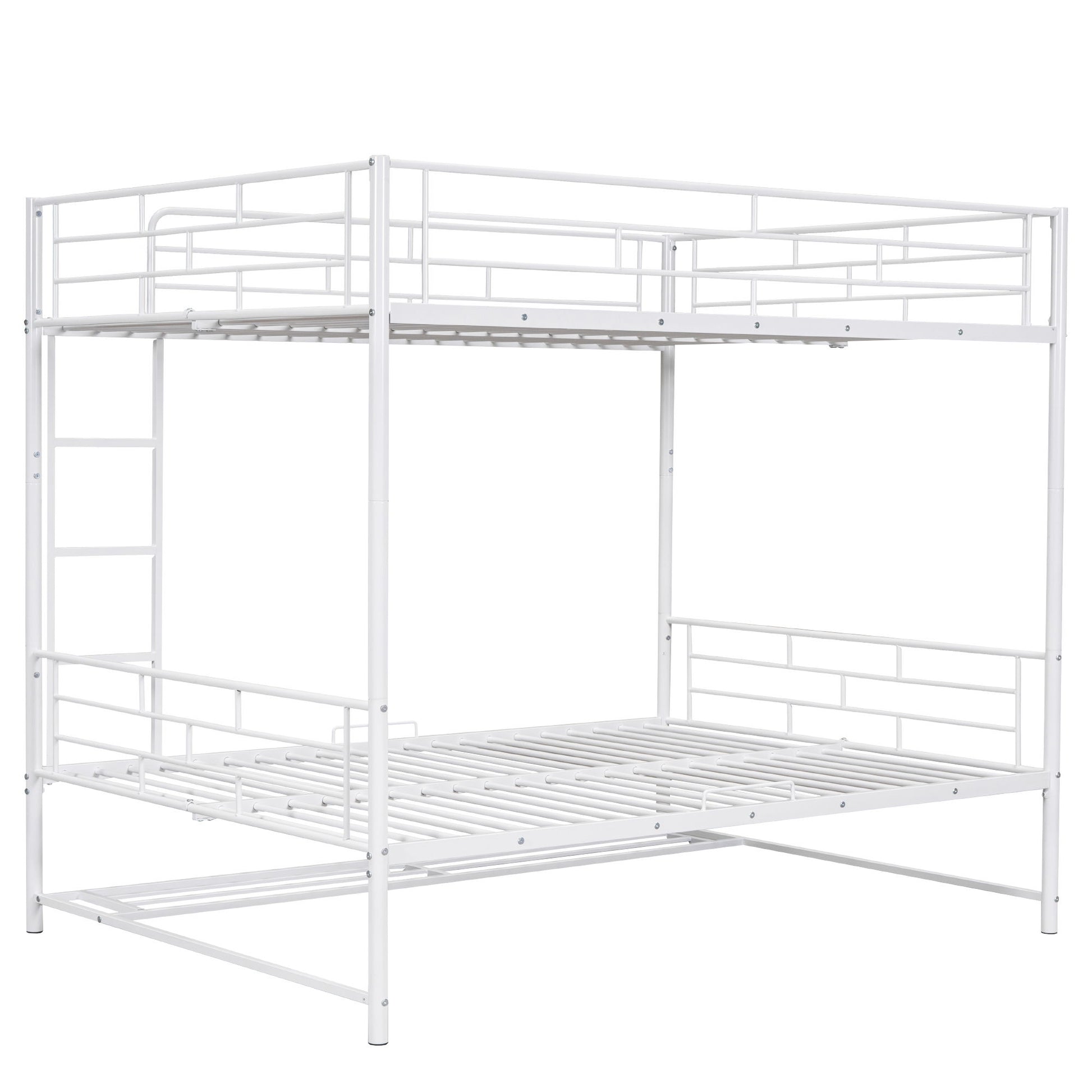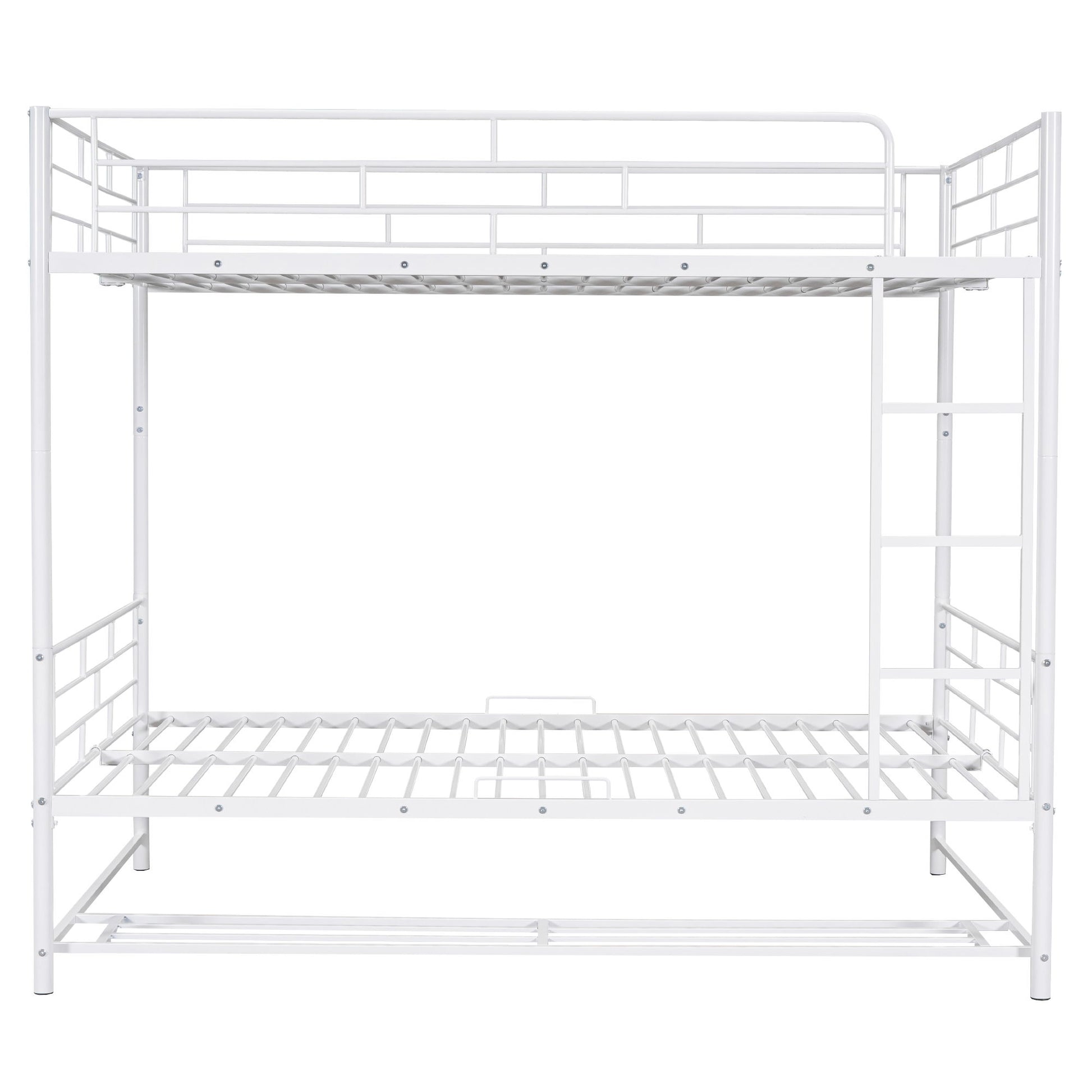 This full over full metal bunk bed is made with sturdy metal and has a clean-cut silhouette that can be matched with any room decor. Designed with safety in mind, this bunk bed comes with a ladder integrated into the frame that is easy to climb up and down. With a practical design, this versatile bunk bed can be separated into two twin beds to meet your different needs.The shelf underneath the bunk bed creates extra space for you to stock shoes, boxes, toys or any small items you like. Some assembly is required, and the bed will definitely be assembled conveniently.