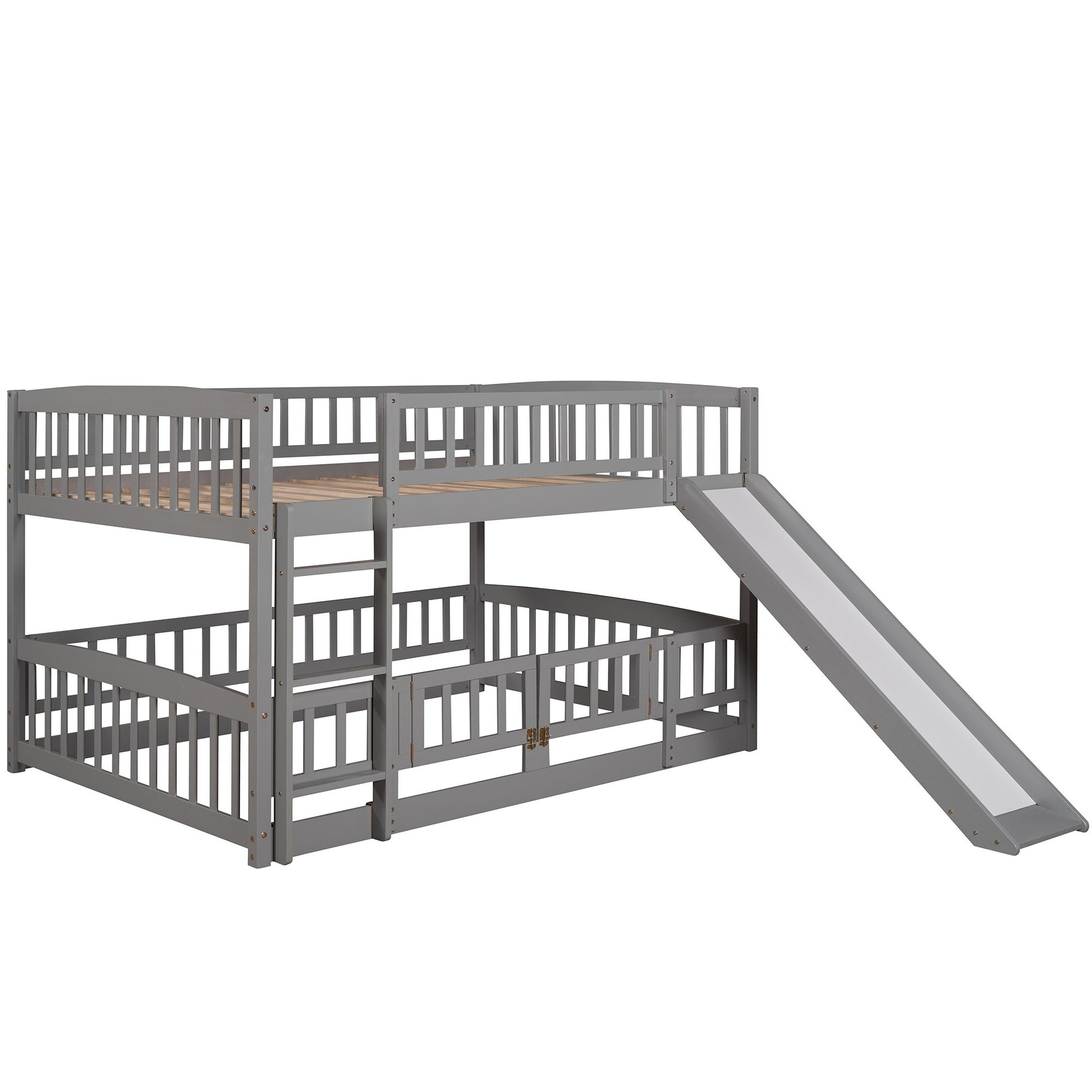 Full Over Full Low Bunk Bed With Slide, Fence And Ladder - Gray