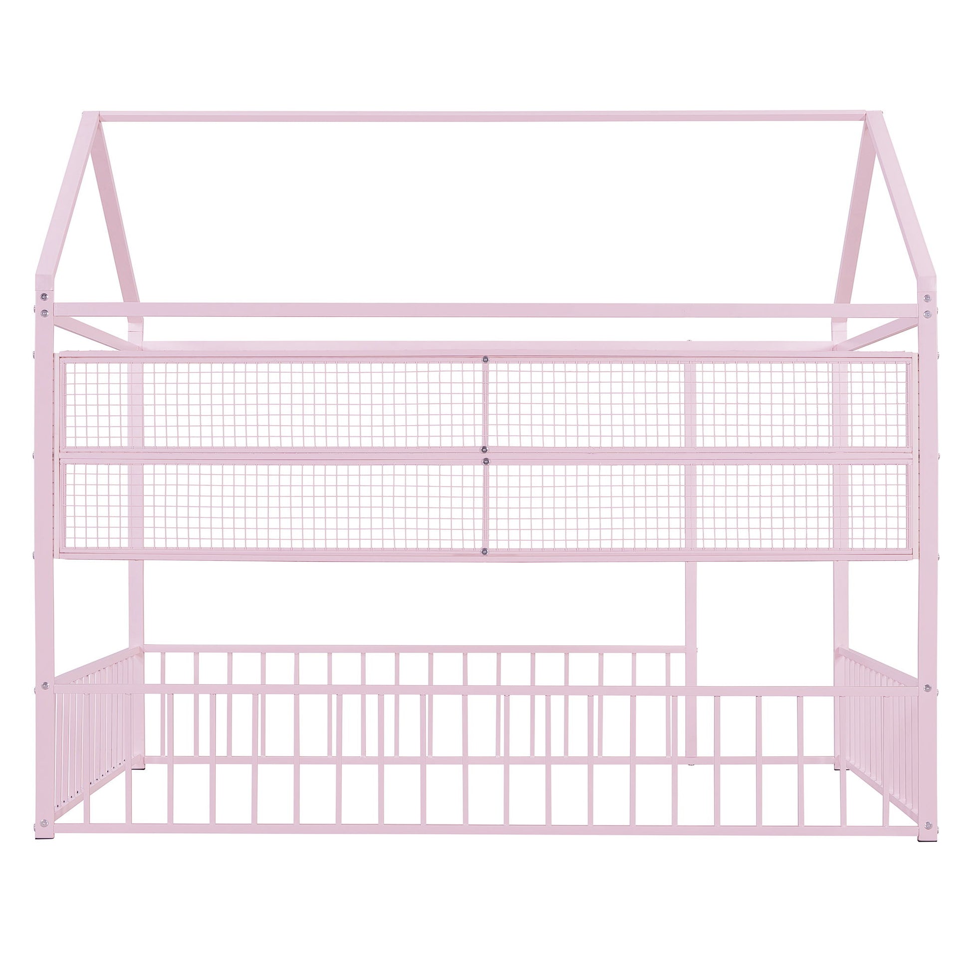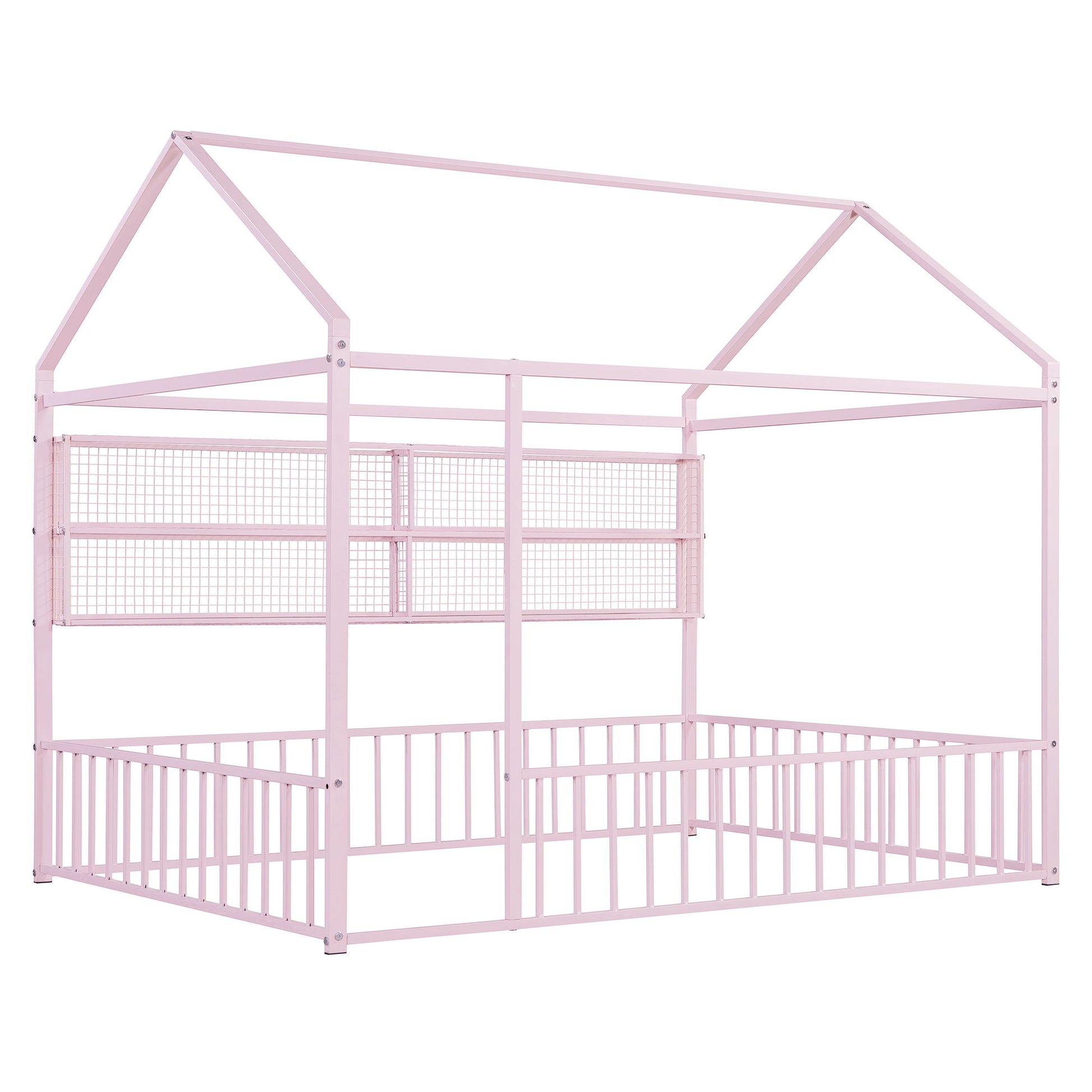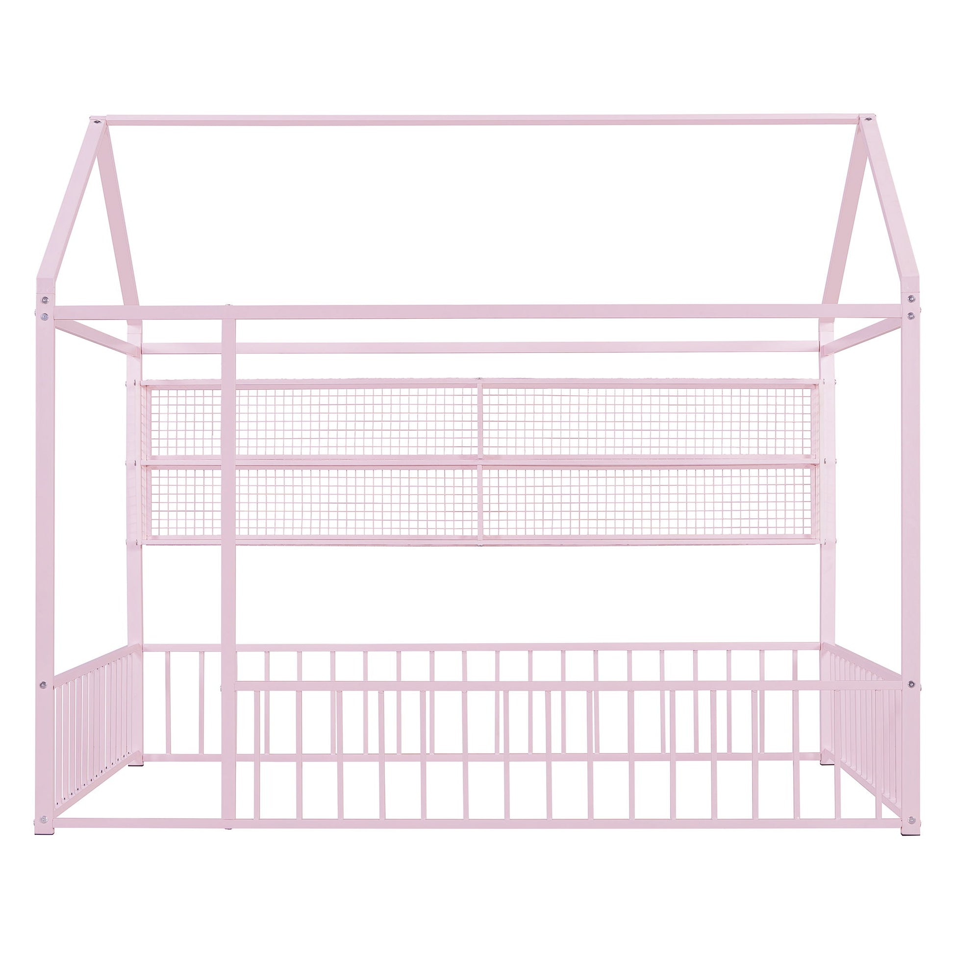 Full Size Bed House Frame With Fence And Shelves - Pink