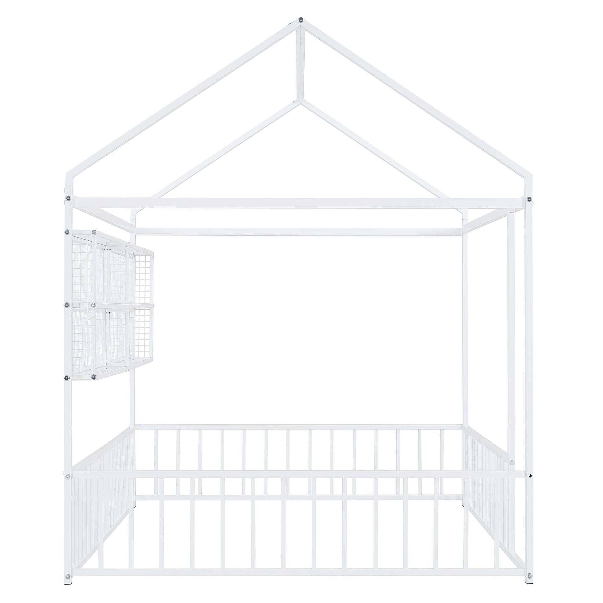 This stylish metal bed frame features a unique house-shaped design, adding a playful yet modern touch to any bedroom. With sturdy metal construction, it ensures long-lasting durability and a secure night's sleep. The back of the bed is equipped with four convenient metal grid shelves, providing extra storage for your essentials while maximizing space. This bed frame blends functionality with a whimsical design, making it a standout piece in any room.