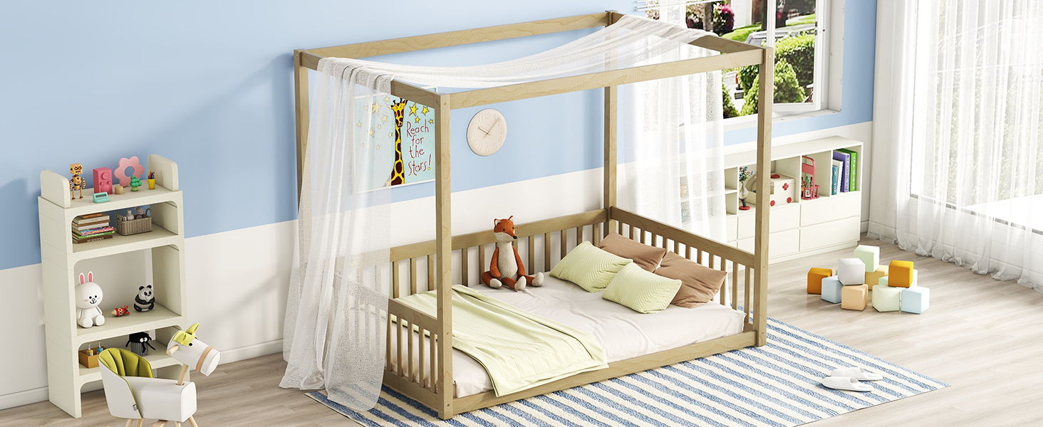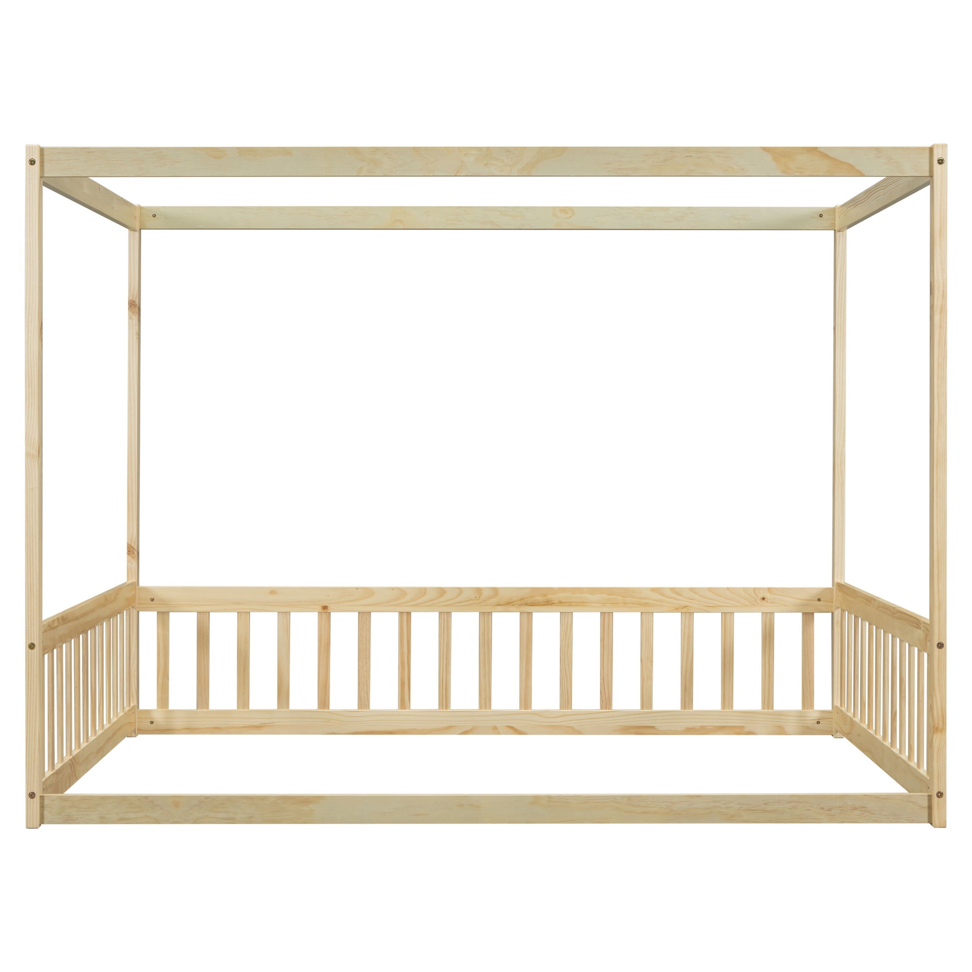 Full Size Canopy Frame Floor Bed With Fence, Guardrails - Natural
