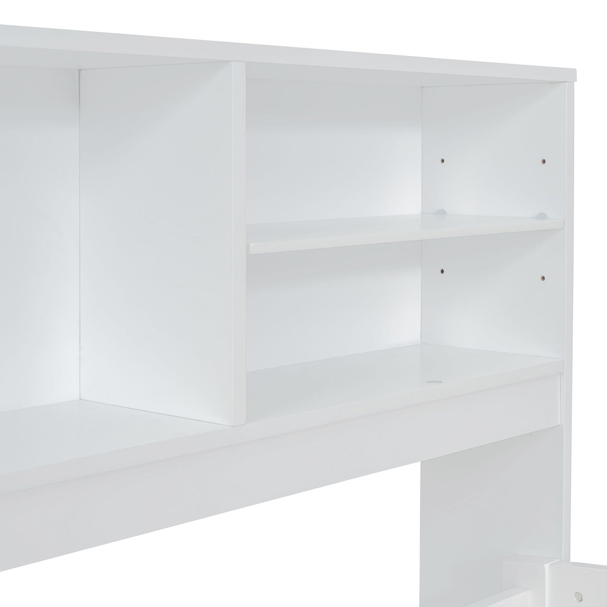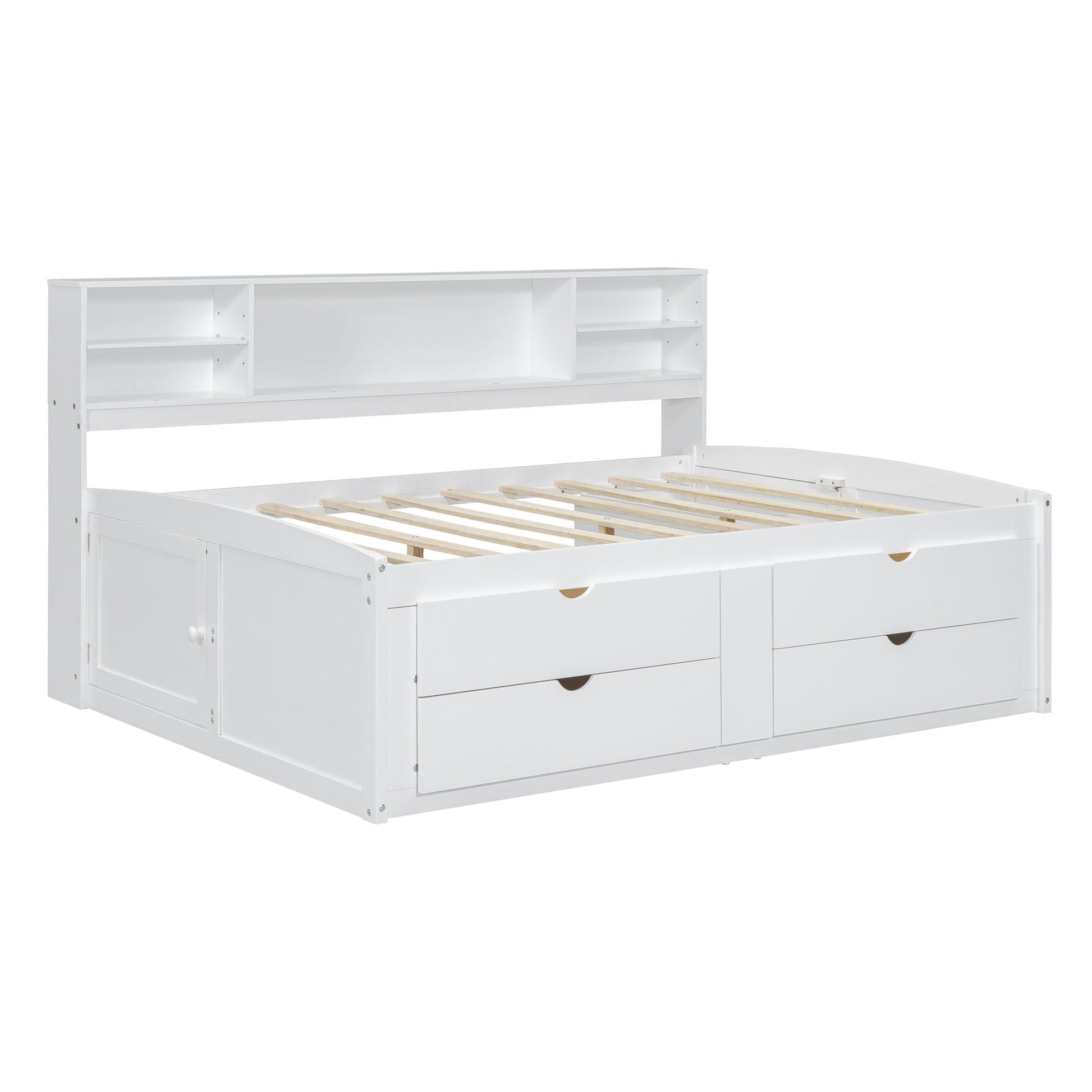 Full Size Daybed With 2 Bedside Cabinets, Upper Shelves And 4 Drawers - White