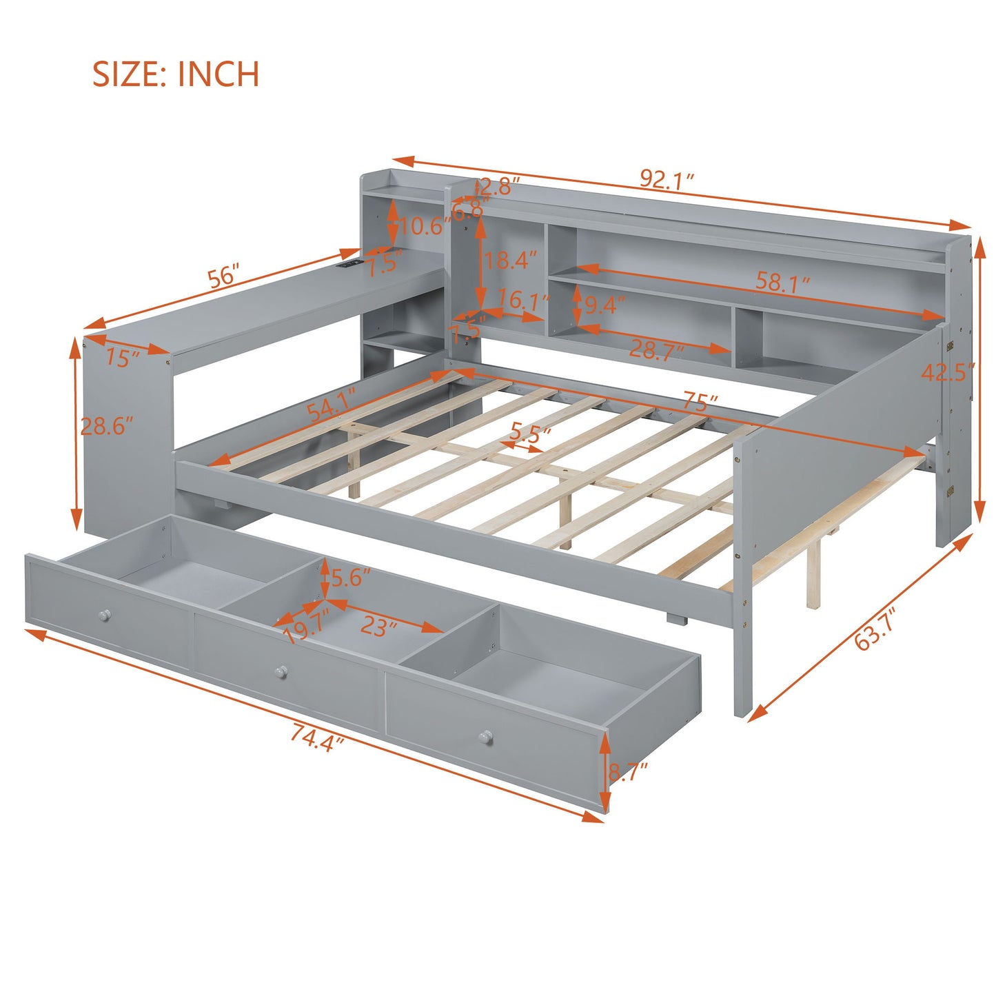 Transform your bedroom with this versatile pine wood bed frame, designed for comfort and style. Made from high-quality pine, it offers exceptional durability with 10 supportive slats, eliminating the need for a box spring.Maximize your space with three spacious drawers for storing clothes and linens, keeping your room organized. The side compartments are perfect for books or small items, and the top surface is ideal for decorative pieces.A standout feature is the integrated desk, equipped with USB ports and power outlets, making it easy to charge your devices while you work or study. This multifunctional design combines a bed and a desk, perfect for smaller spaces.With overall dimensions of 92.1''L x63.7"W x 42.5"H, it fits various bedroom layouts.