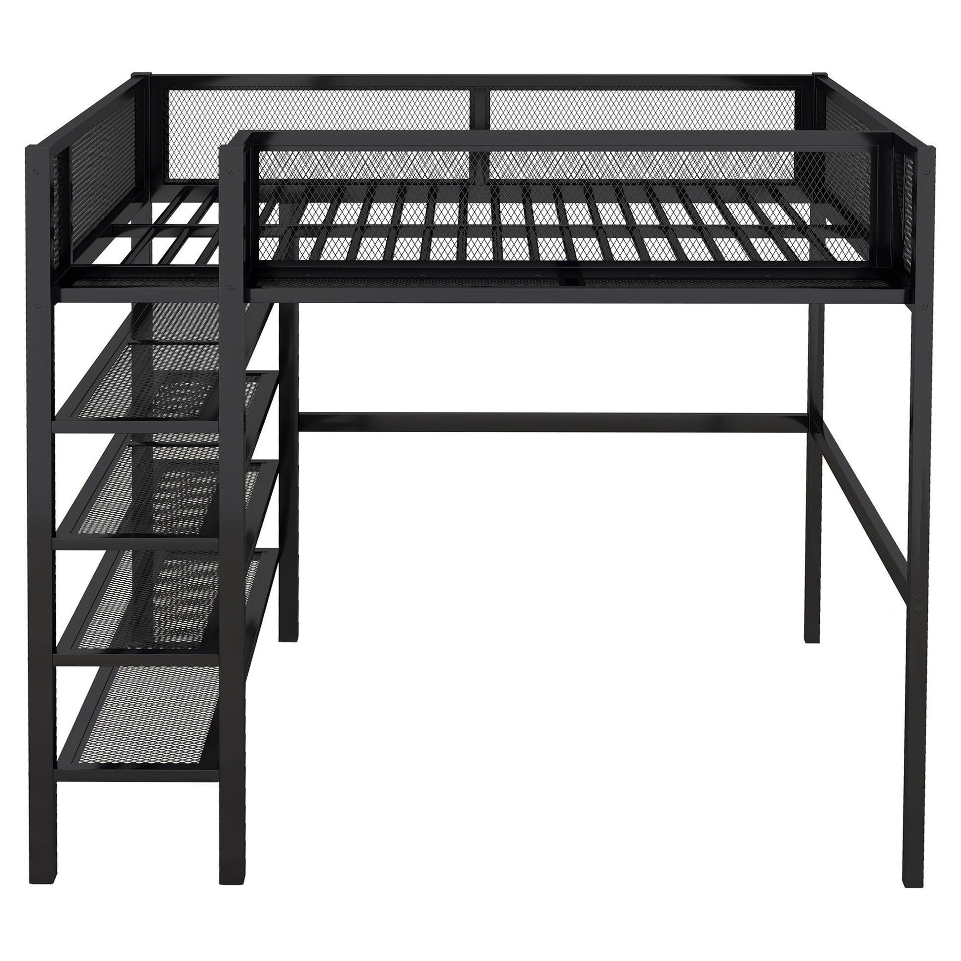 This twin-size metal loft bed with storage space is made from sturdy metal and features a clean-cut silhouette that complements any room decor. It includes 4-tier open shelves and a storage shelf beside the bed guardrail, making it easy to grab items without getting out of bed. With this collection, you can transform any space into a workstation, reading nook, or lounge area.