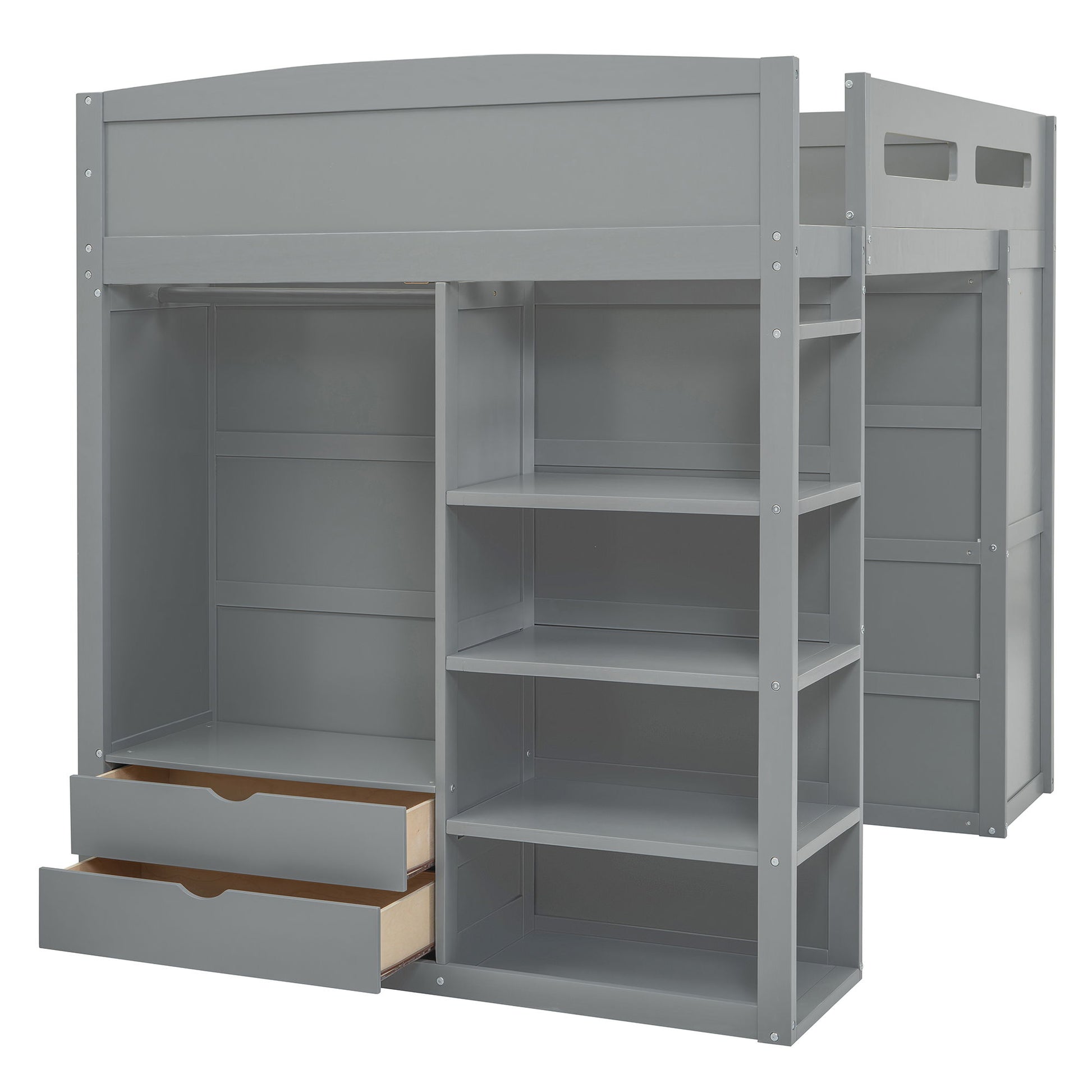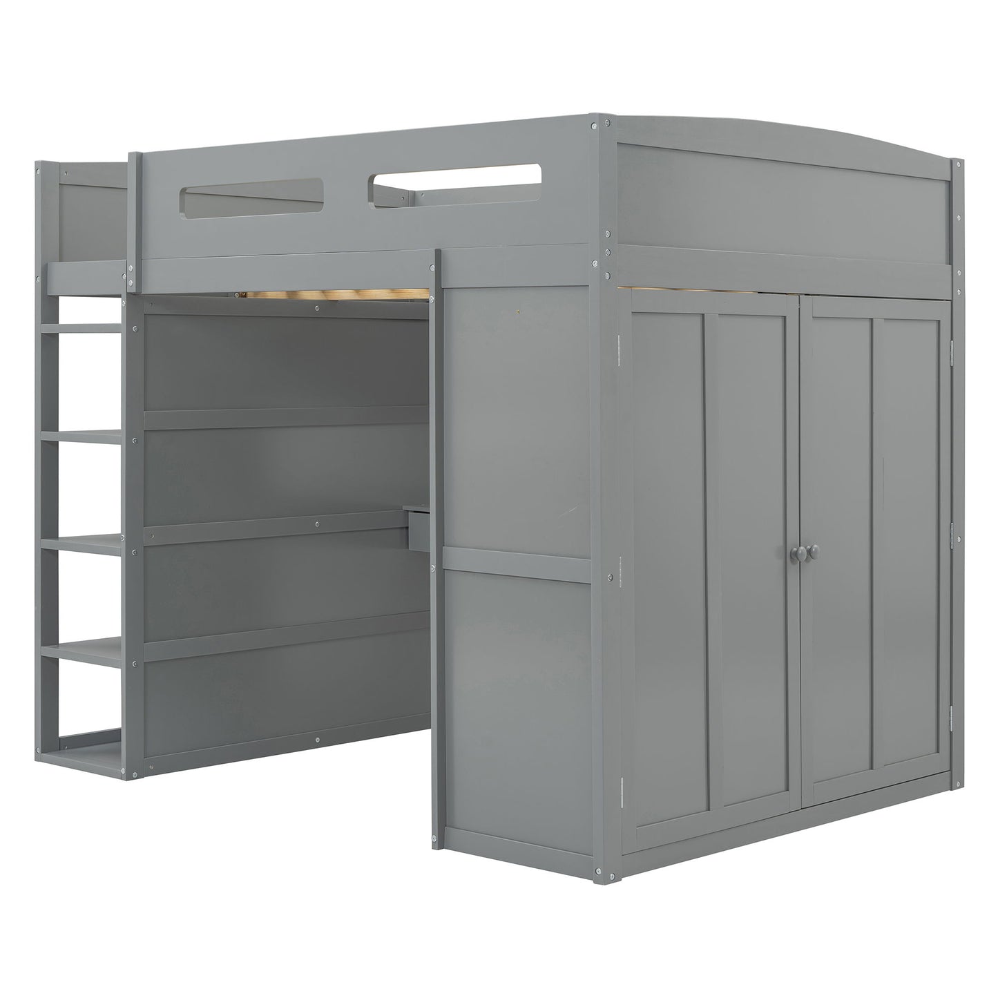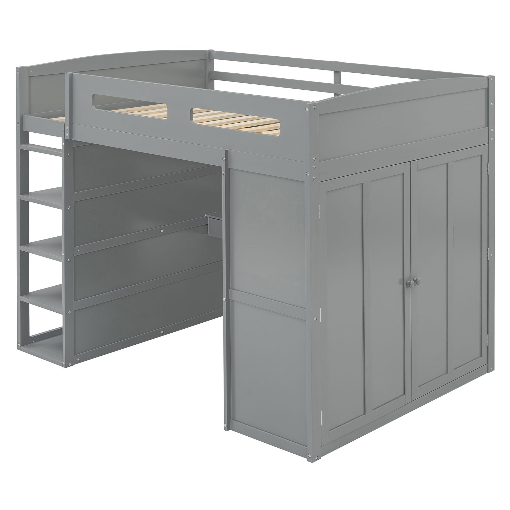 Full Size Loft Bed With Desk, Wardrobes, 4 Drawers And 4 Shelves - Gray