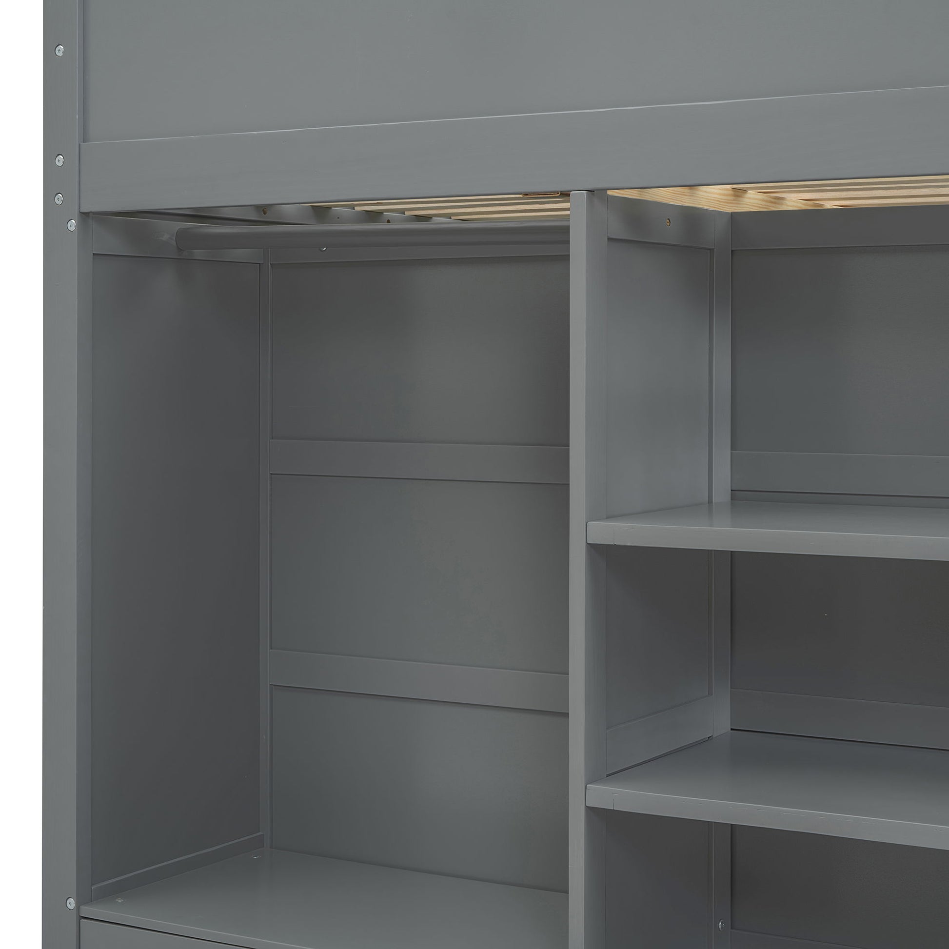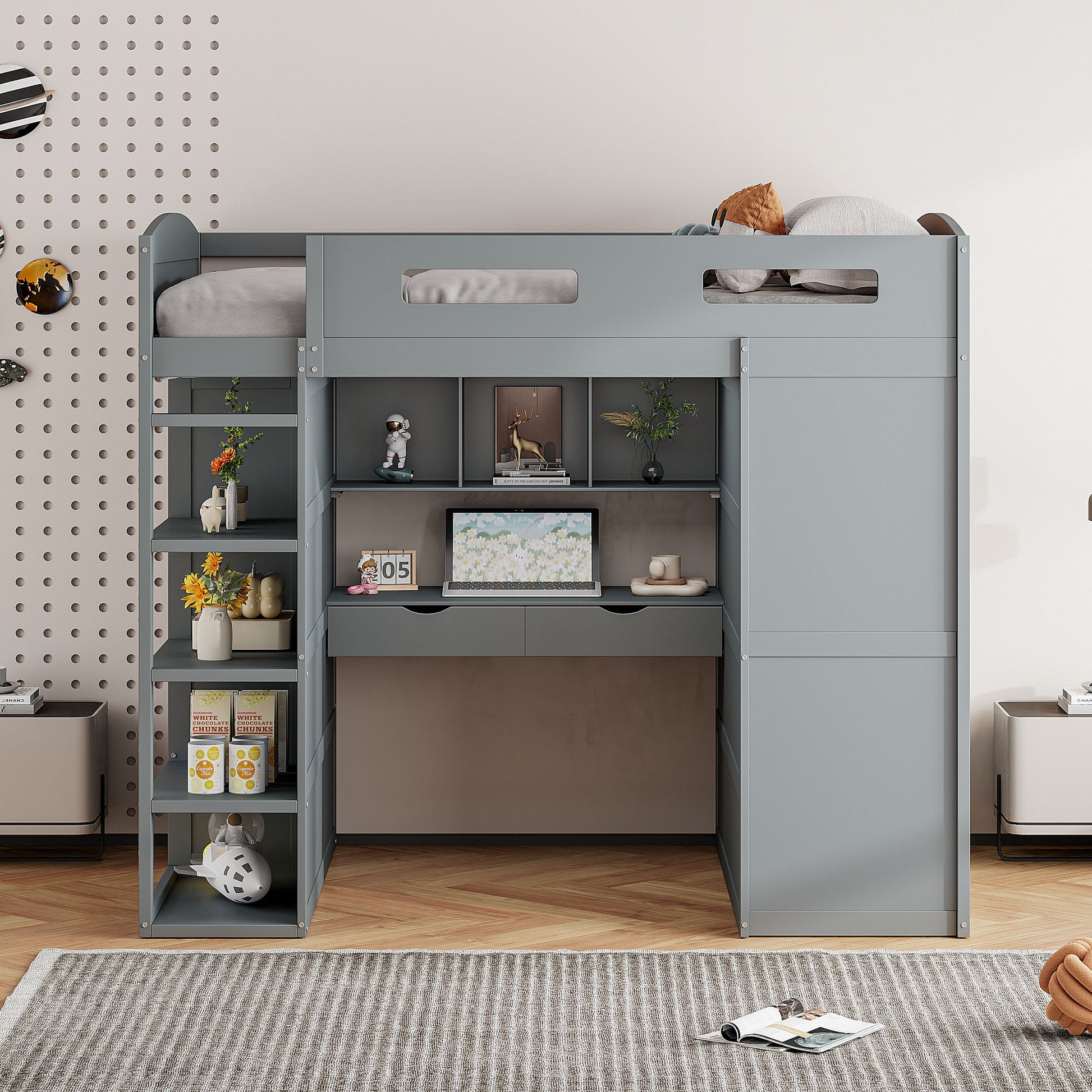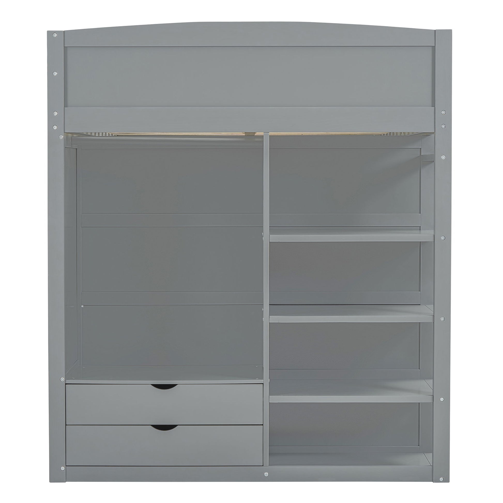 Full Size Loft Bed With Desk, Wardrobes, 4 Drawers And 4 Shelves - Gray