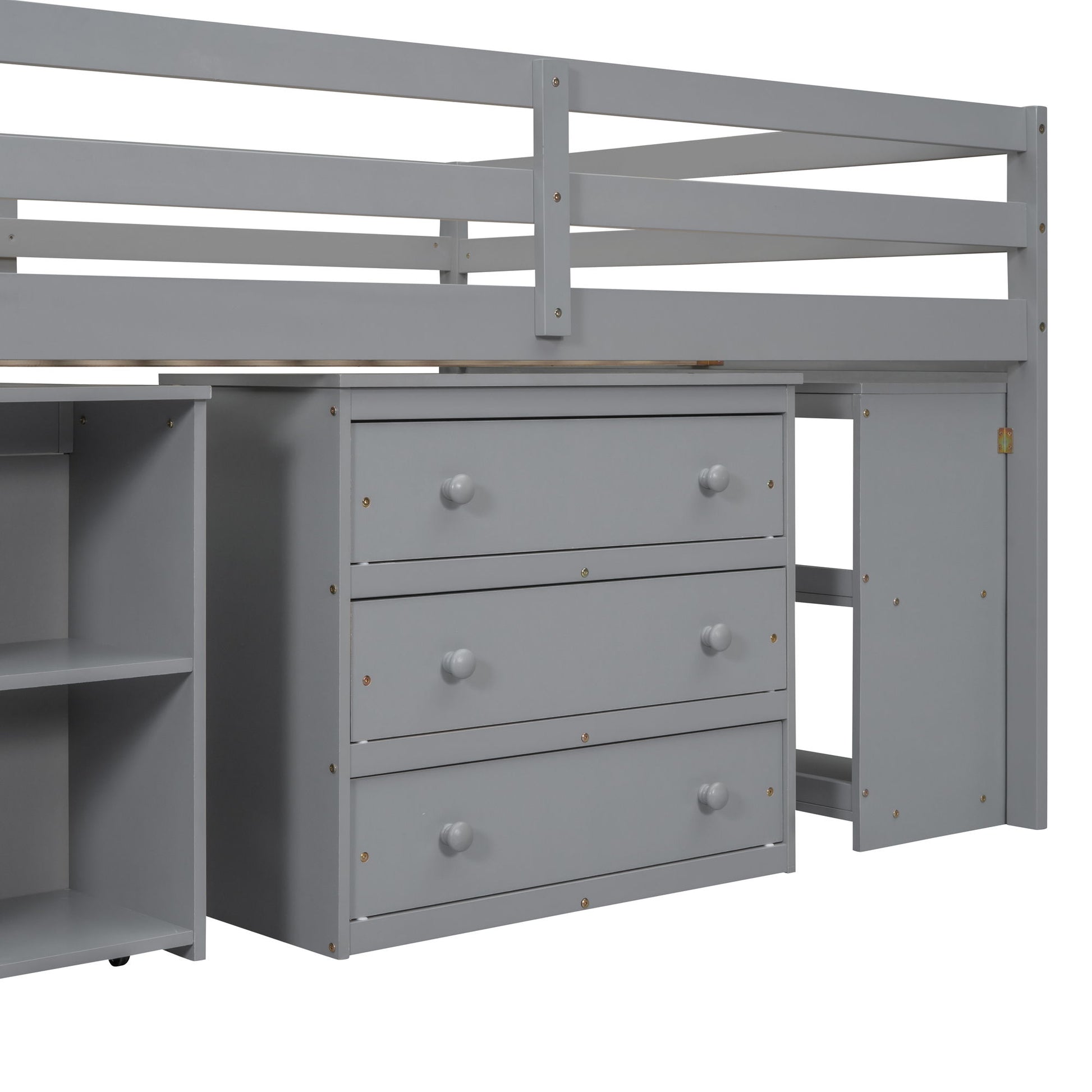 Full Size Loft Bed With Retractable Writing Desk And 3 Drawers With Storage Stairs And Shelves - Gray