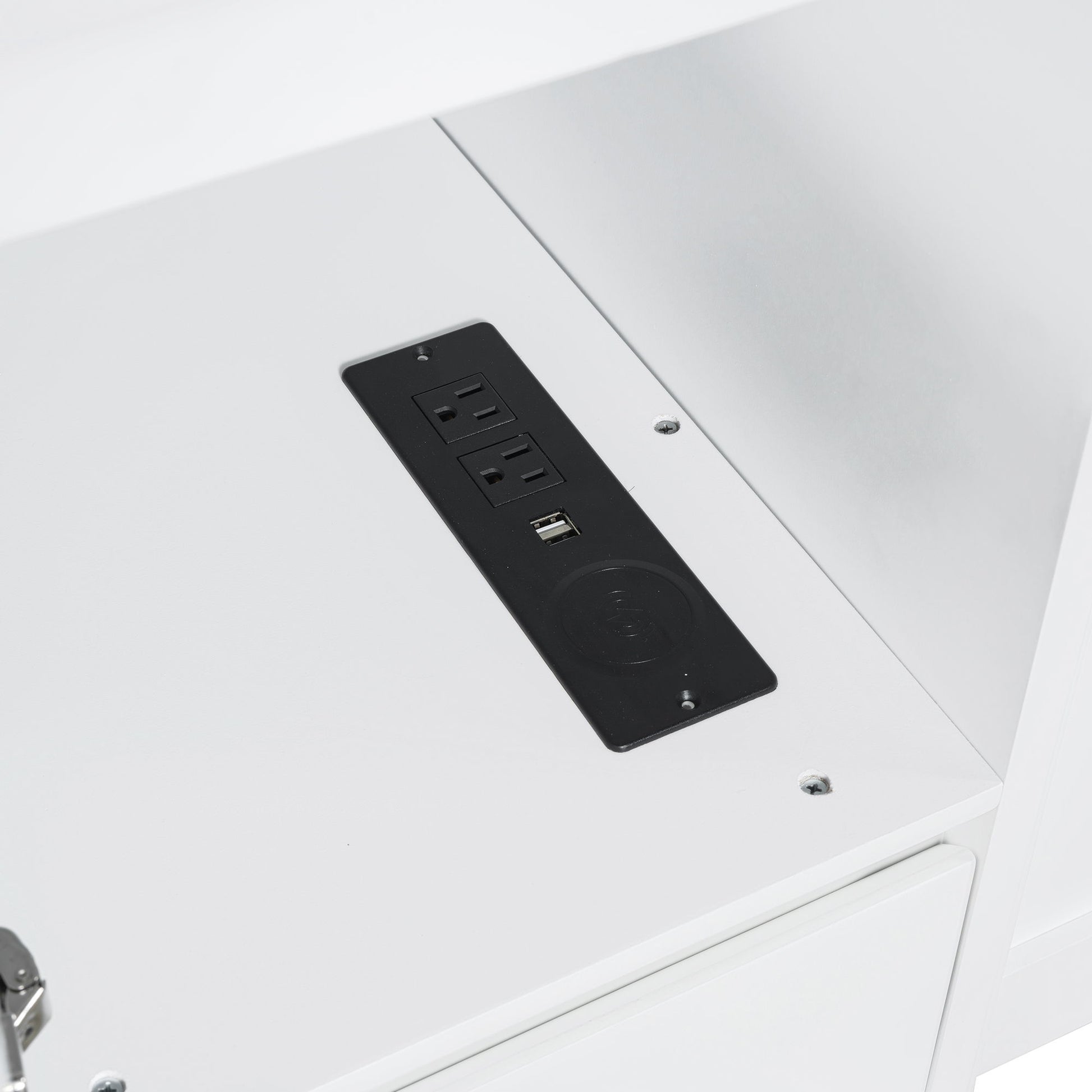 - Ample Storage: Includes drawers and double-layer cabinets, with an integrated power strip.