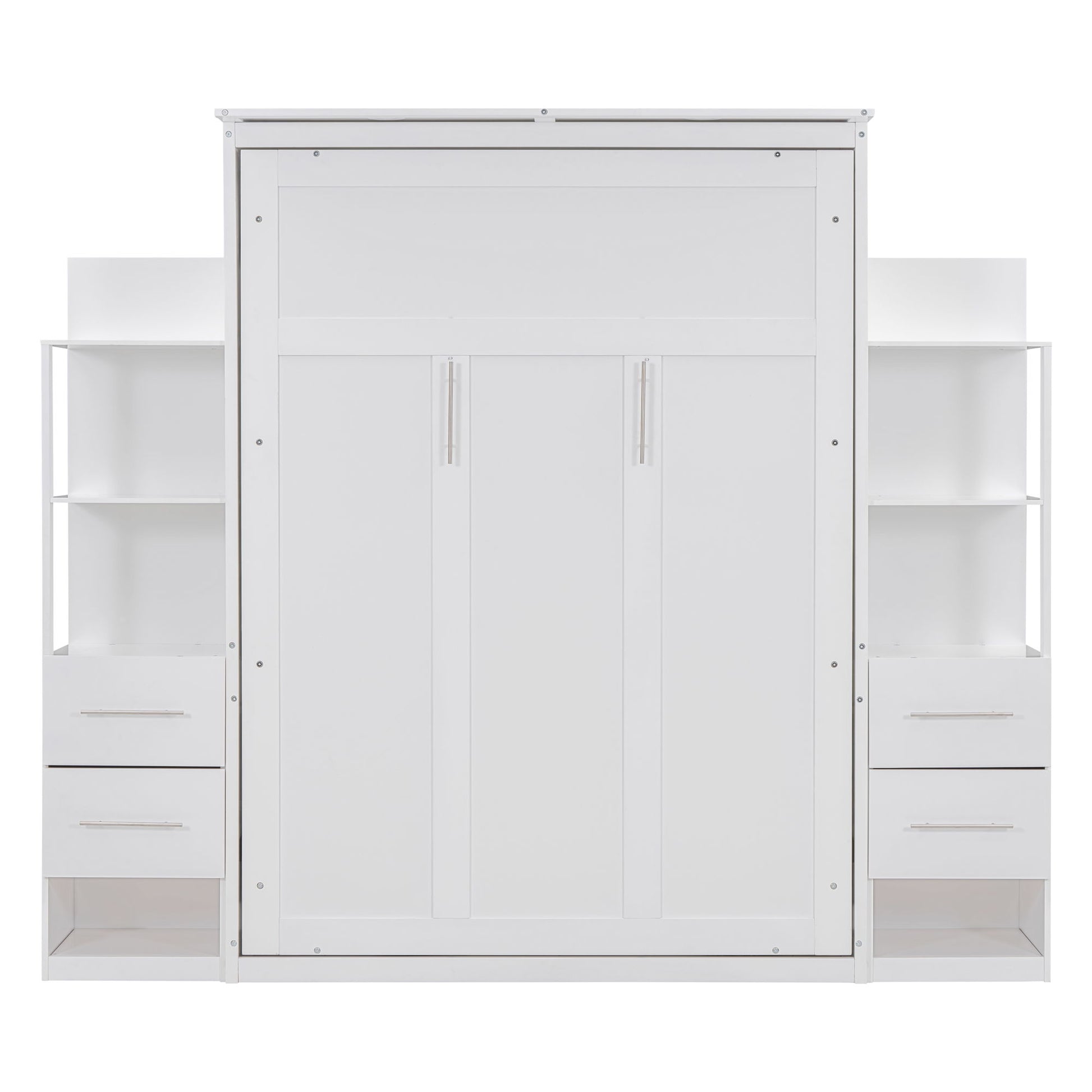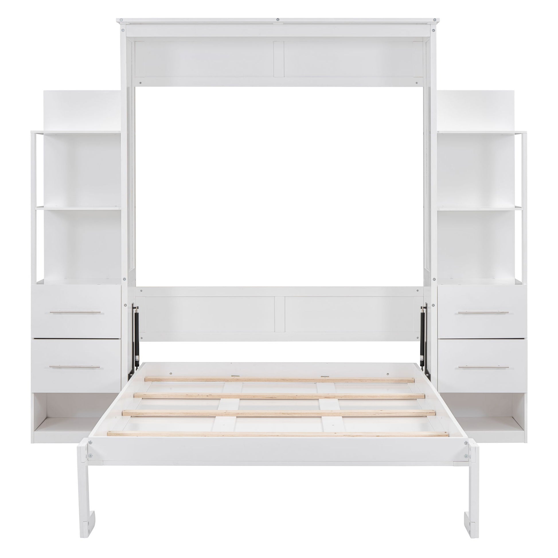 Full Size Murphy Wall Bed With Shelves, Drawers And LED Lights - White