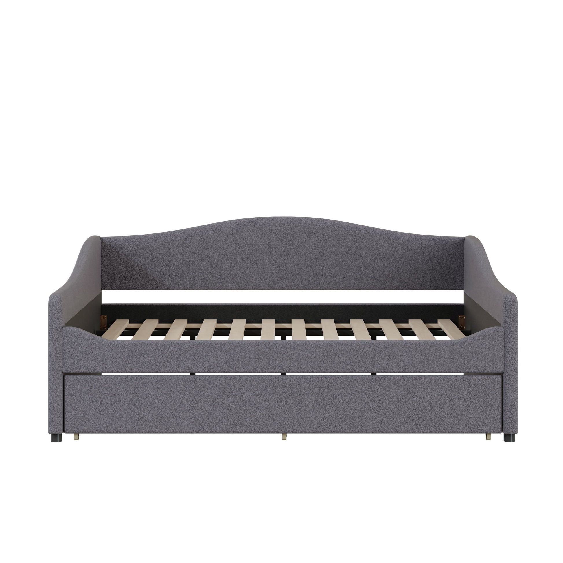 Embossed with light stripes on each side, this daybed adds an artistic touch to your home. The playful yet modern design creates a relaxing and comfortable atmosphere, making it a fun and inviting space. The sleek track-style frame serves as an eye-catching focal point. Featuring a twin-size trundle, this bed is perfect for small apartments or those who love sleepovers. Simply roll out the trundle when needed and tuck it away when not in use. This daybed is both a beautiful and practical addition to any bedroom.