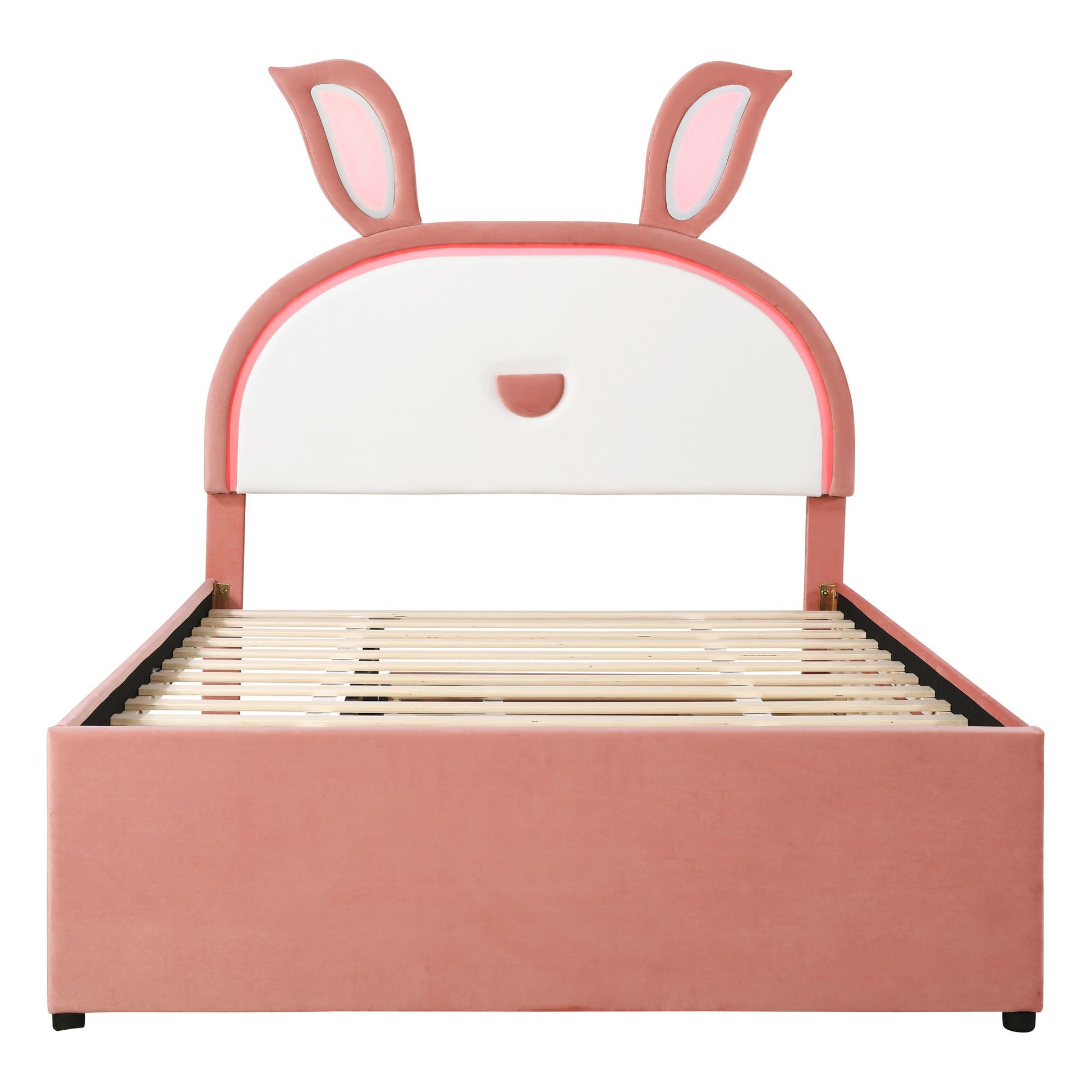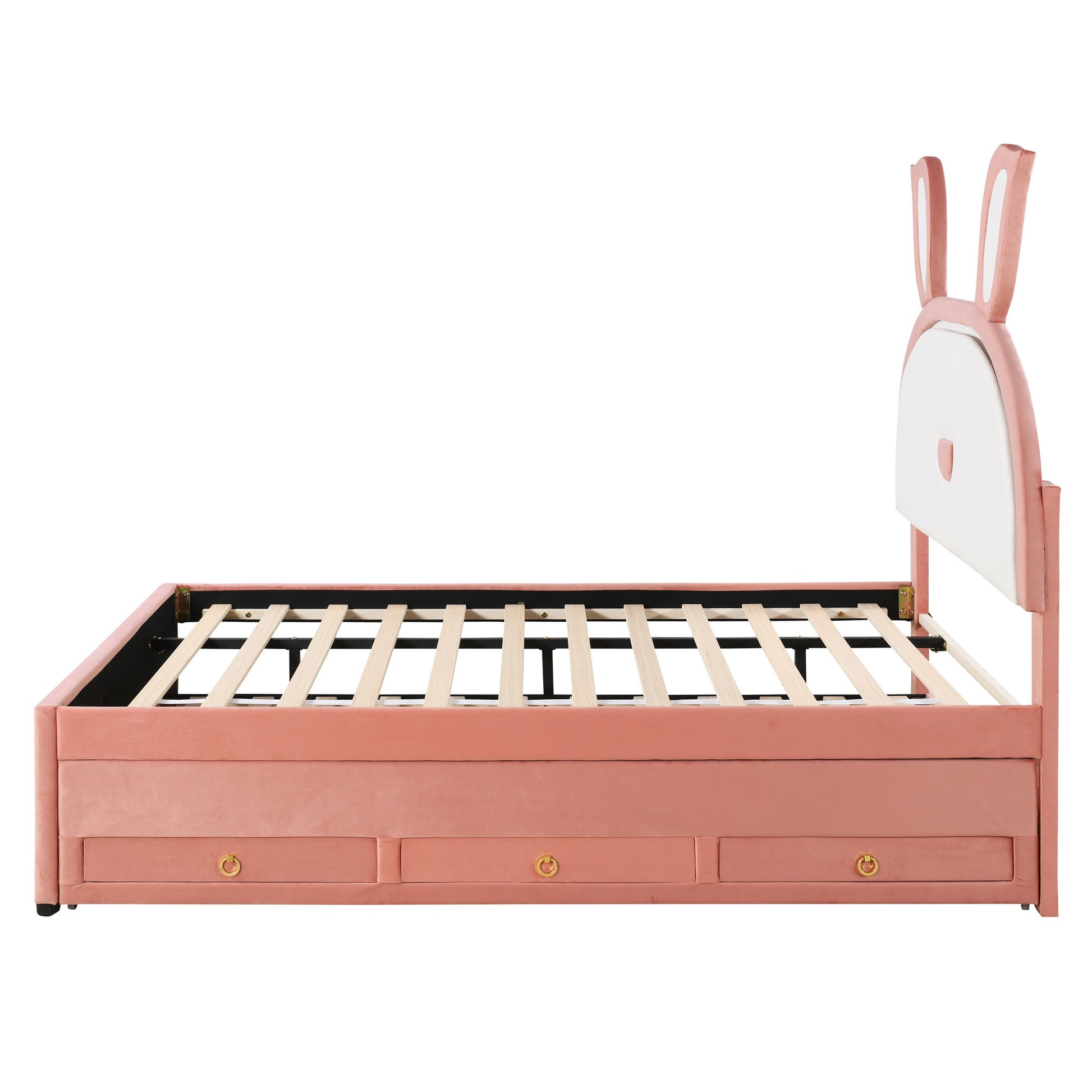 Full Size Upholstered Platform Bed With Trundle And 3 Drawers, Rabbit-Shaped Headboard With Embedded LED Lights - Pink