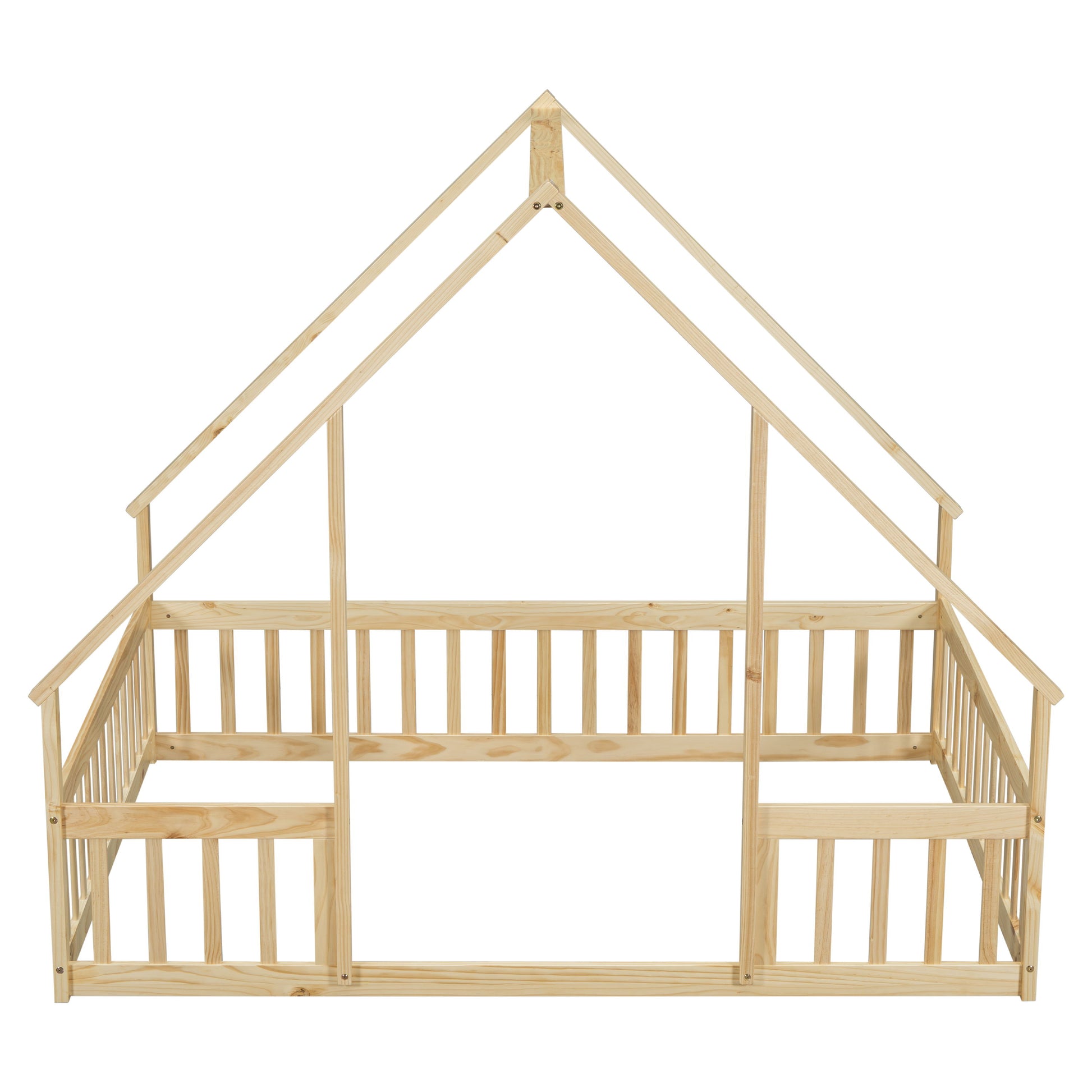Full Wood House-Shaped Floor Bed With Fence, Guardrails - Natural
