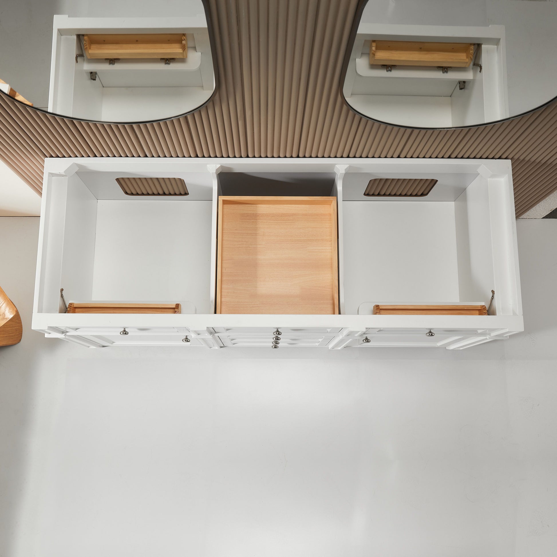 - Spacious Design: Features two sinks, two flip drawers, four functional drawers, and two cabinet doors with an internal partition for extra storage space. Ideal for shared bathrooms or adding a luxurious touch to any home.