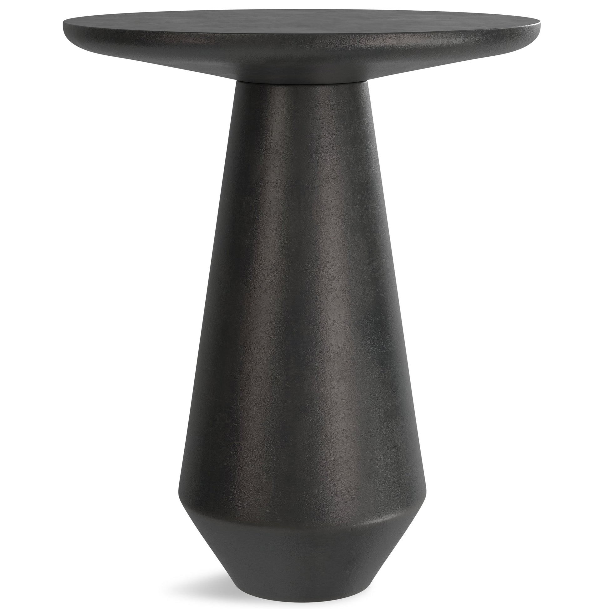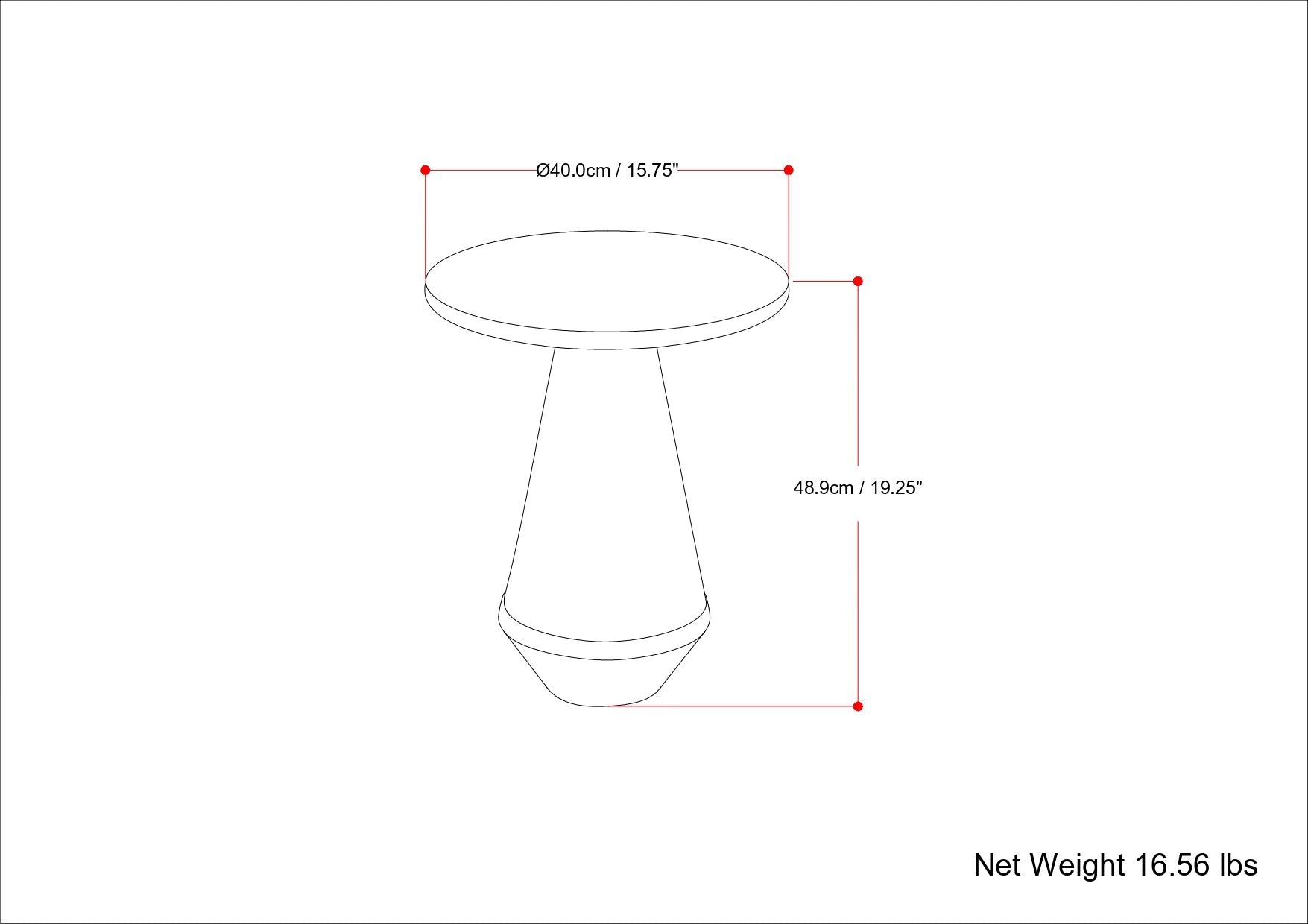 - Features a sleek design with a circular tabletop and flared base that tapers at the bottom.