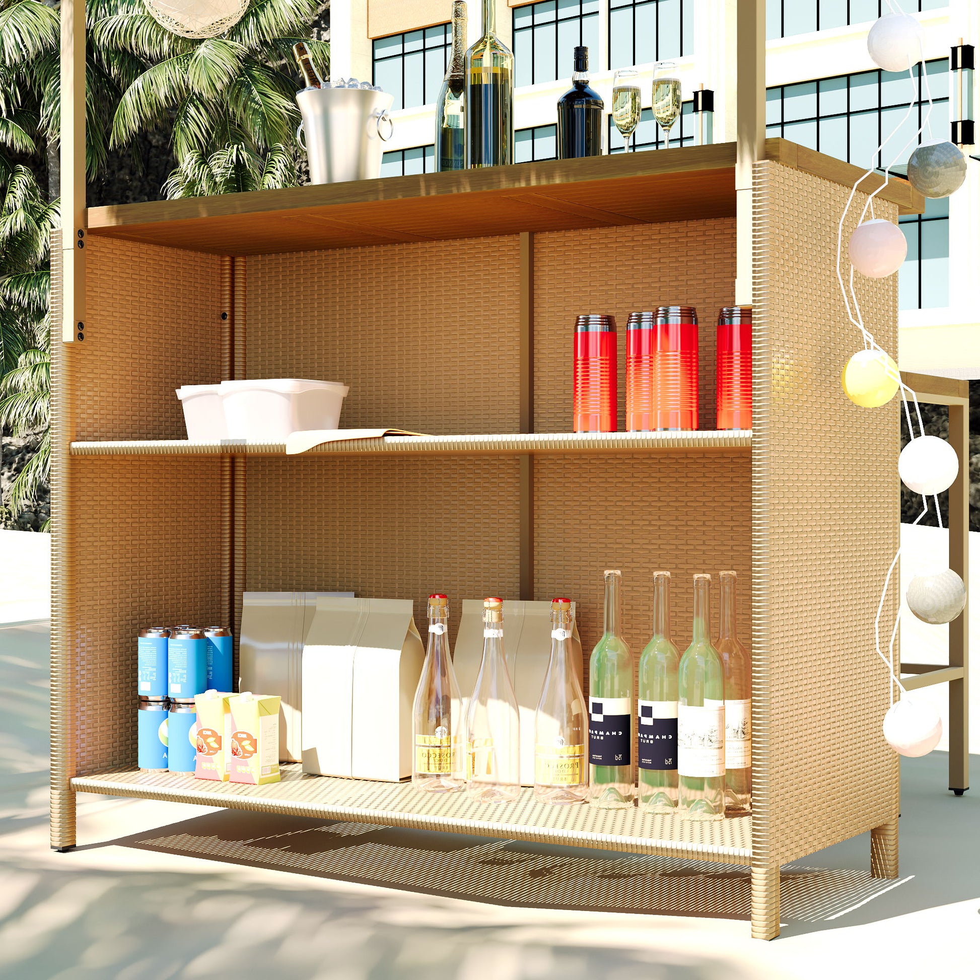 - Weatherproof Construction:This outdoor bar set features a durable metal frame with PE rattan weaving. The waterproof, sun-resistant acacia wood tabletop and grass canopy ensure long-lasting beauty and functionality.
