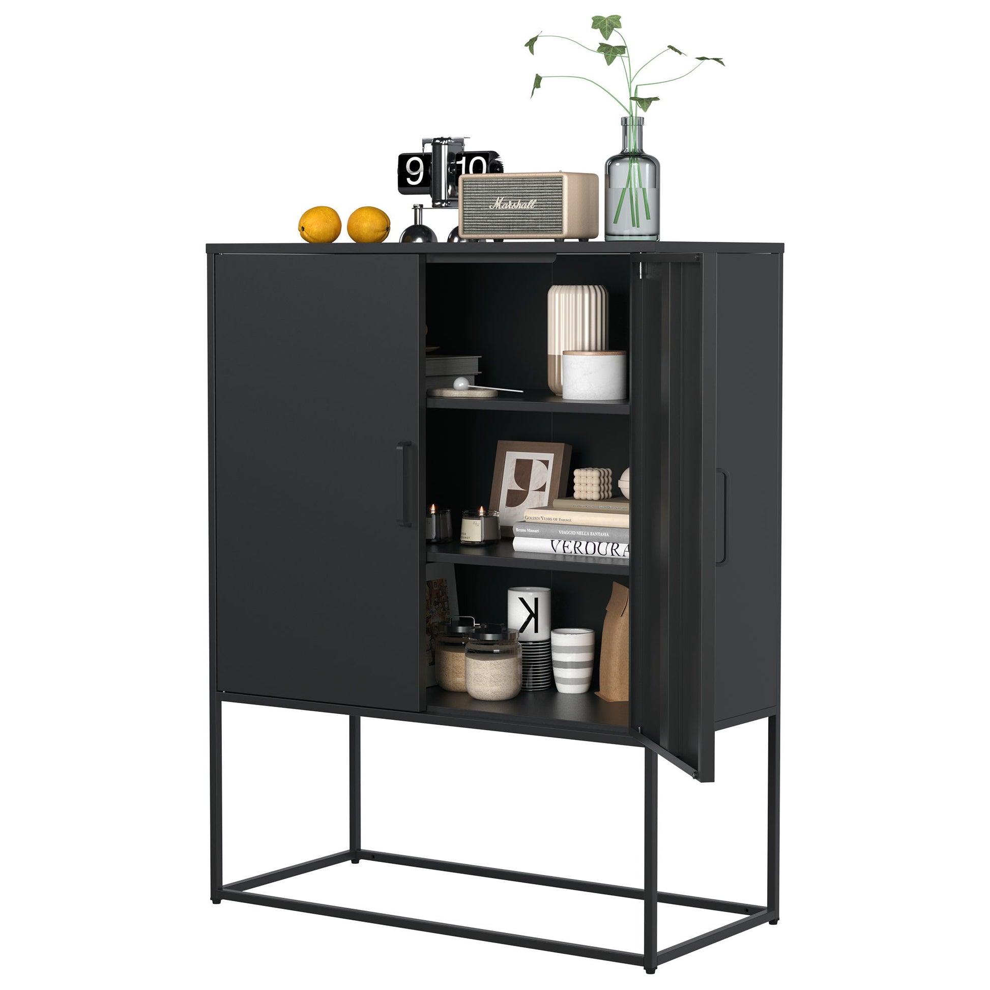 Heavy Duty Metal Buffet Sideboard Modern Steel Storage Cabinet With 2 Shelves, Free Standing Accent Cabinet With Magnetic Doors For Bedroom, Kitchen, And Home Office, Anti-Tip Design - Black