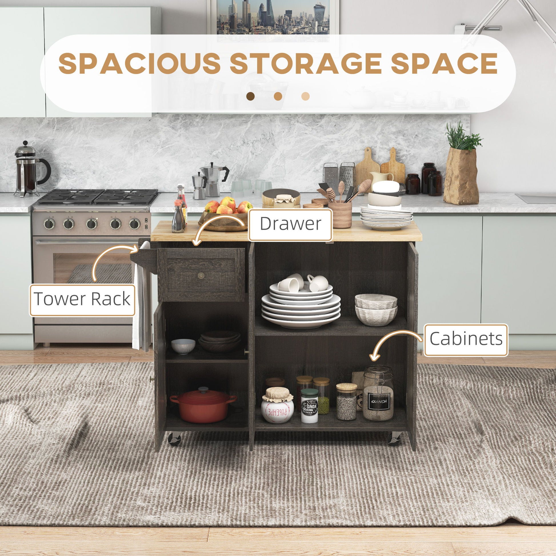 Homcom - Triple-Cabinet Rolling Kitchen Island On Wheels, Kitchen Cart With Storage Shelf Adjustment, Rolling Utility Cart With Wood Top, Towel Rack, Big Drawer - Distressed Brown