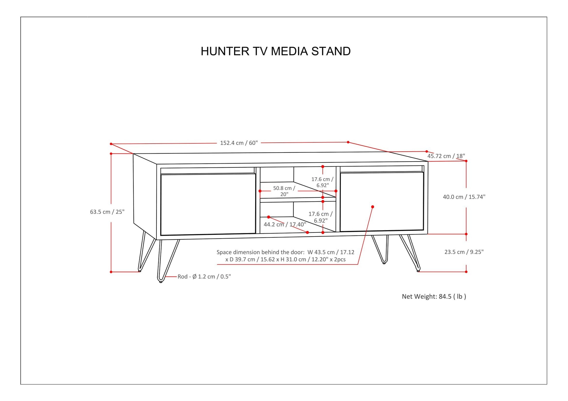 - Features two (2) side cabinets with two (2) adjustable shelves and soft closing hinges with open central space with one (1) shelf and four (4) black iron hairpin legs