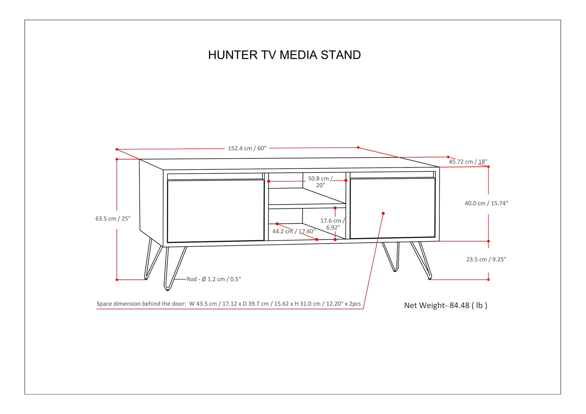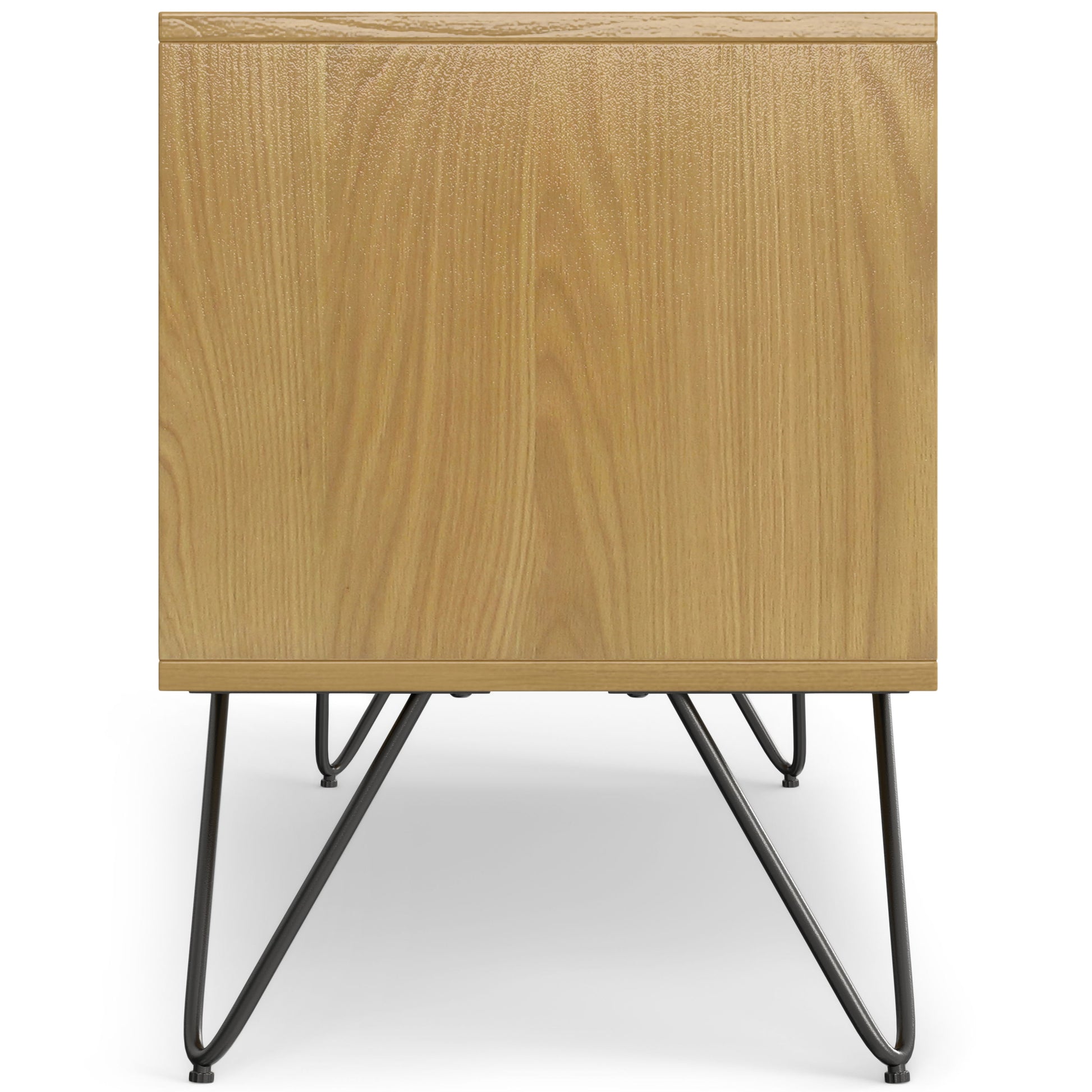 - Features two (2) side cabinets with two (2) adjustable shelves and soft closing hinges with open central space with one (1) shelf and four (4) black iron hairpin legs