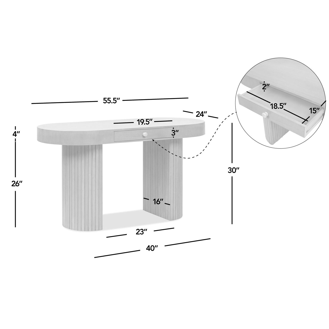 - Contemporary Aesthetic: Thick, half moon shaped fluted pillar legs enhance the desk's contemporary design.