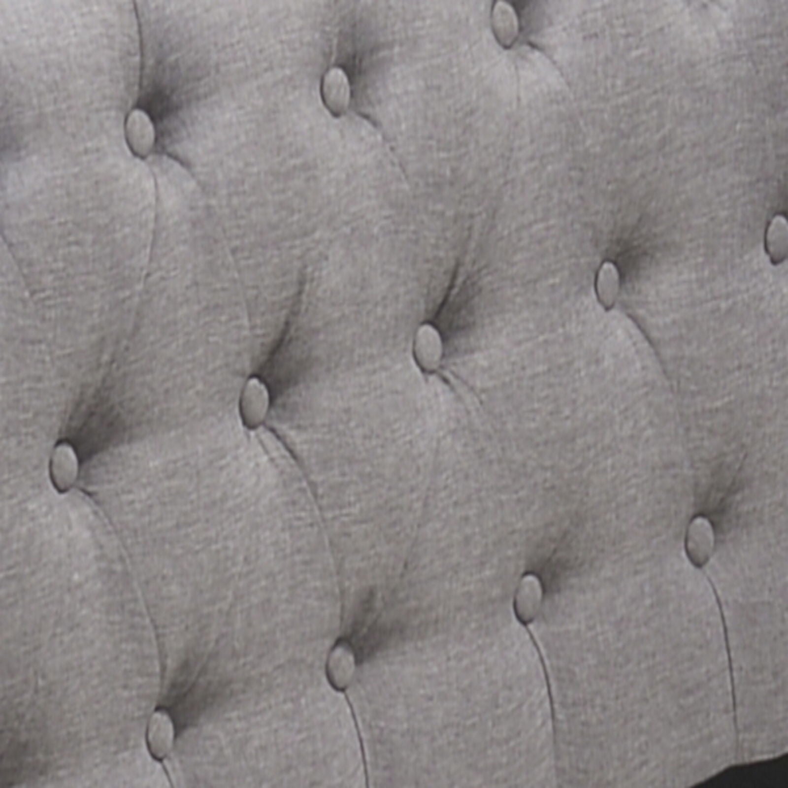 - Design and Material: This daybed features a Chesterfield shape with a fully padded design, upholstered in fabric. It includes button tufted detailing and nailhead trim in a nickel finish, enhancing its elegant appearance. The daybed is supported by wooden round legs with a black finish.