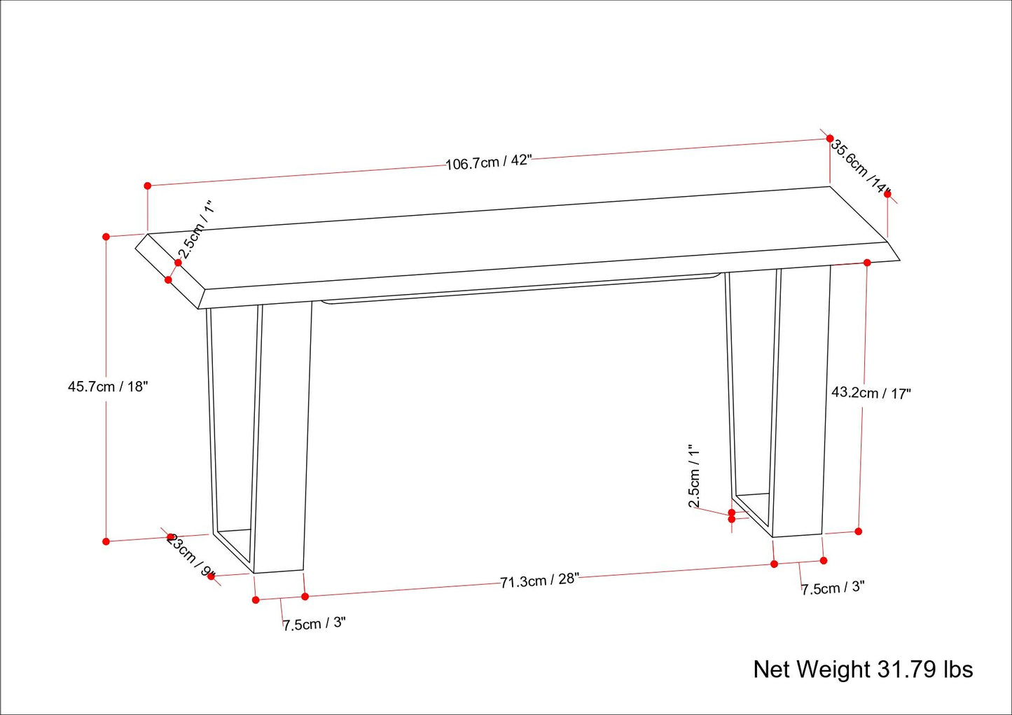 - Dimensions: 14" d x 42" w x 18" h
