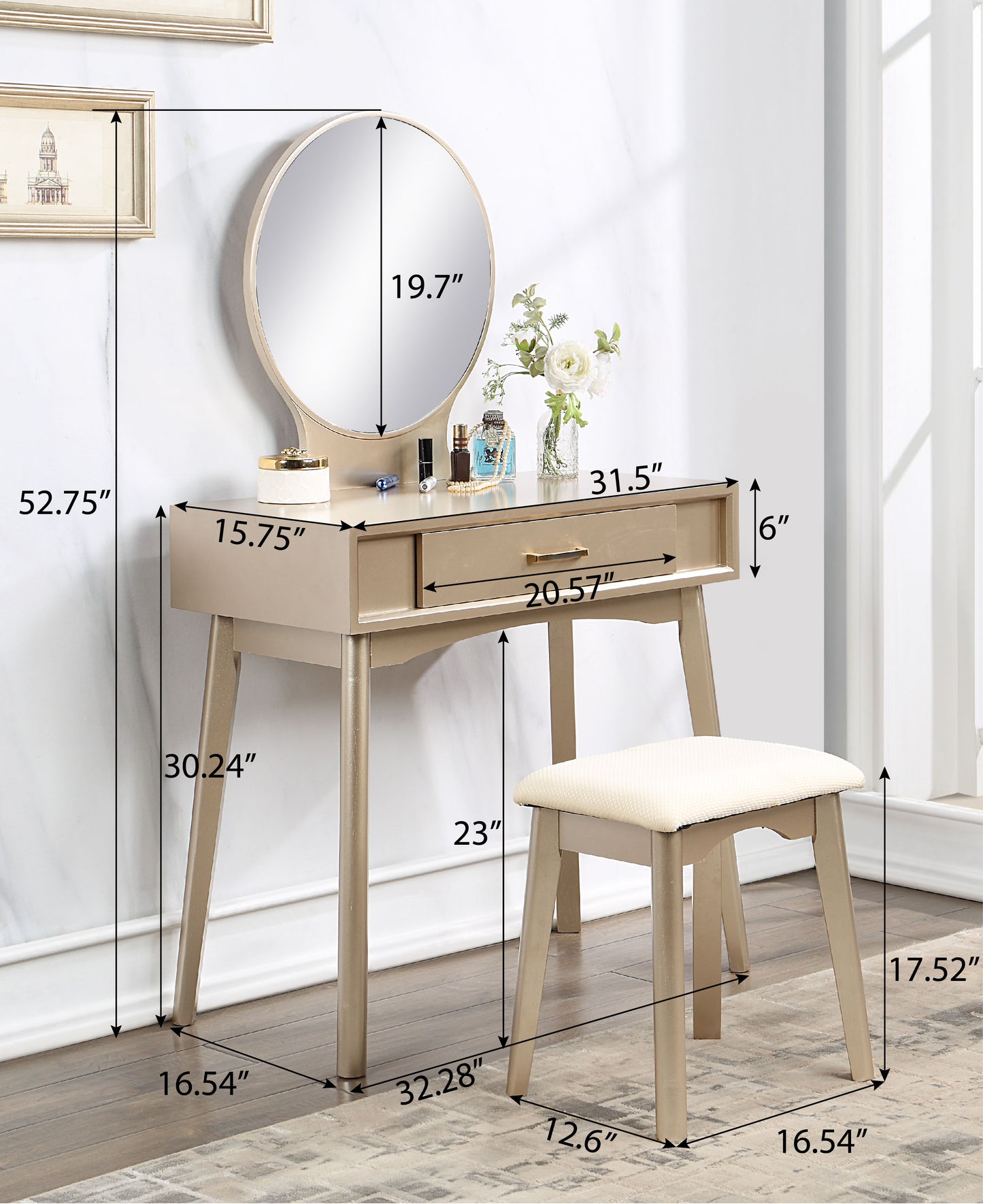 - Dimensions and Details: Vanity dimensions: 32.28"W x 16.54"D x 52.75"H. Mirror diameter: 19.7". Table top: 31.5"W x 15.75"D. Drawer width: 20.57". Stool dimensions: 16.54"W x 12.6"D x 17.52"H.