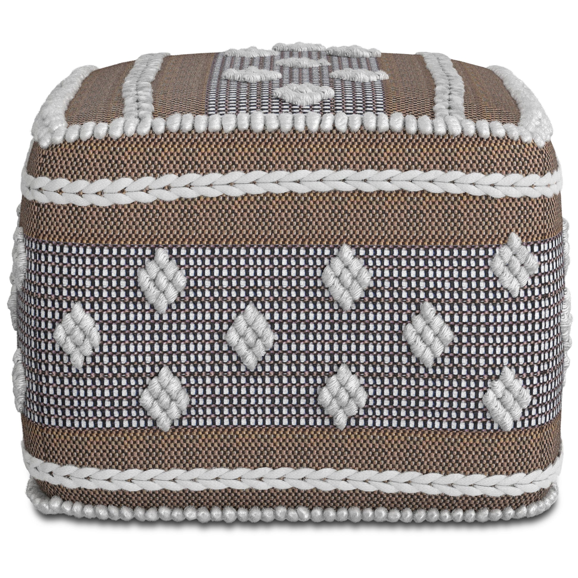 - Handcrafted with Handcrafted with 100% recycled PET woven polyester in a white, beige and grey pattern
