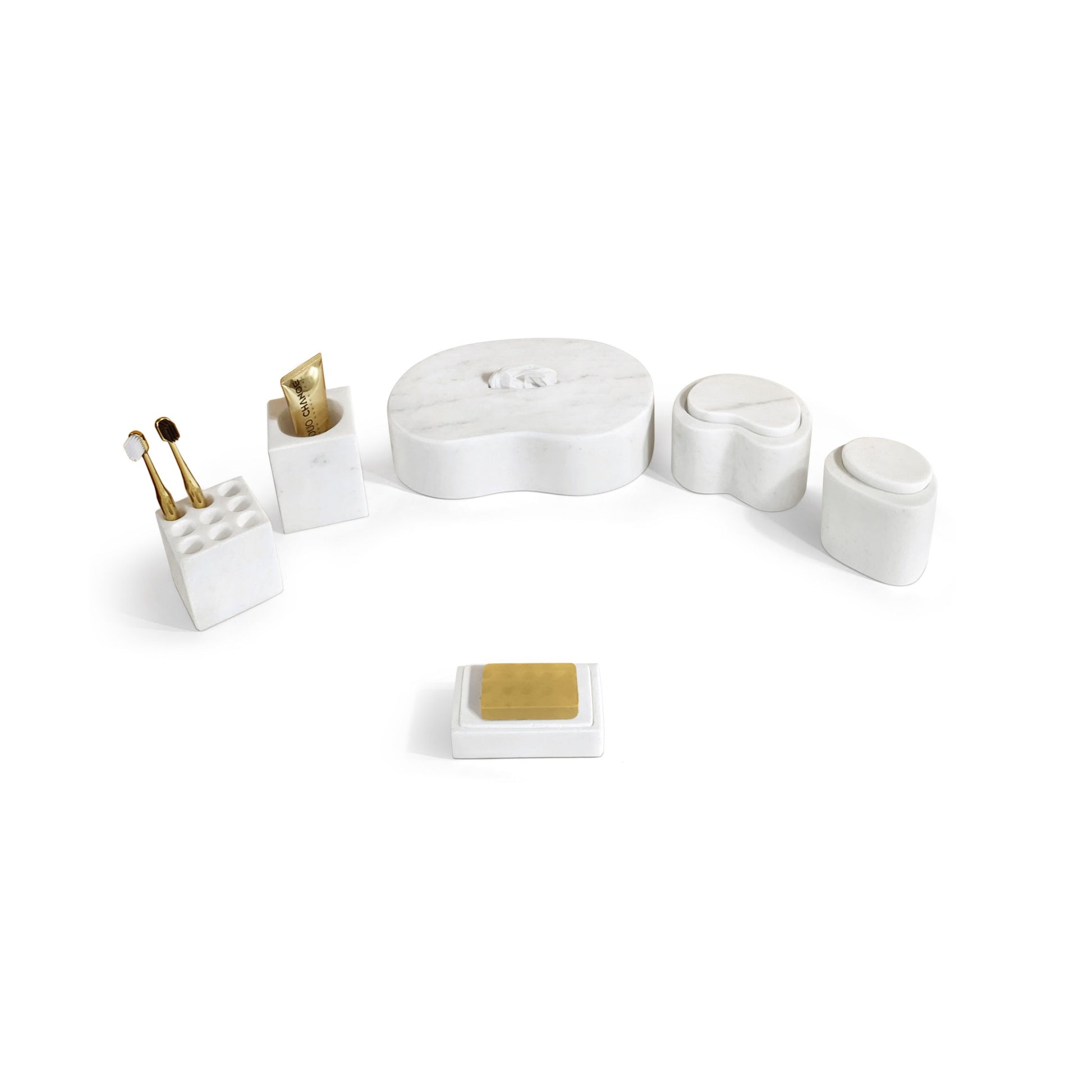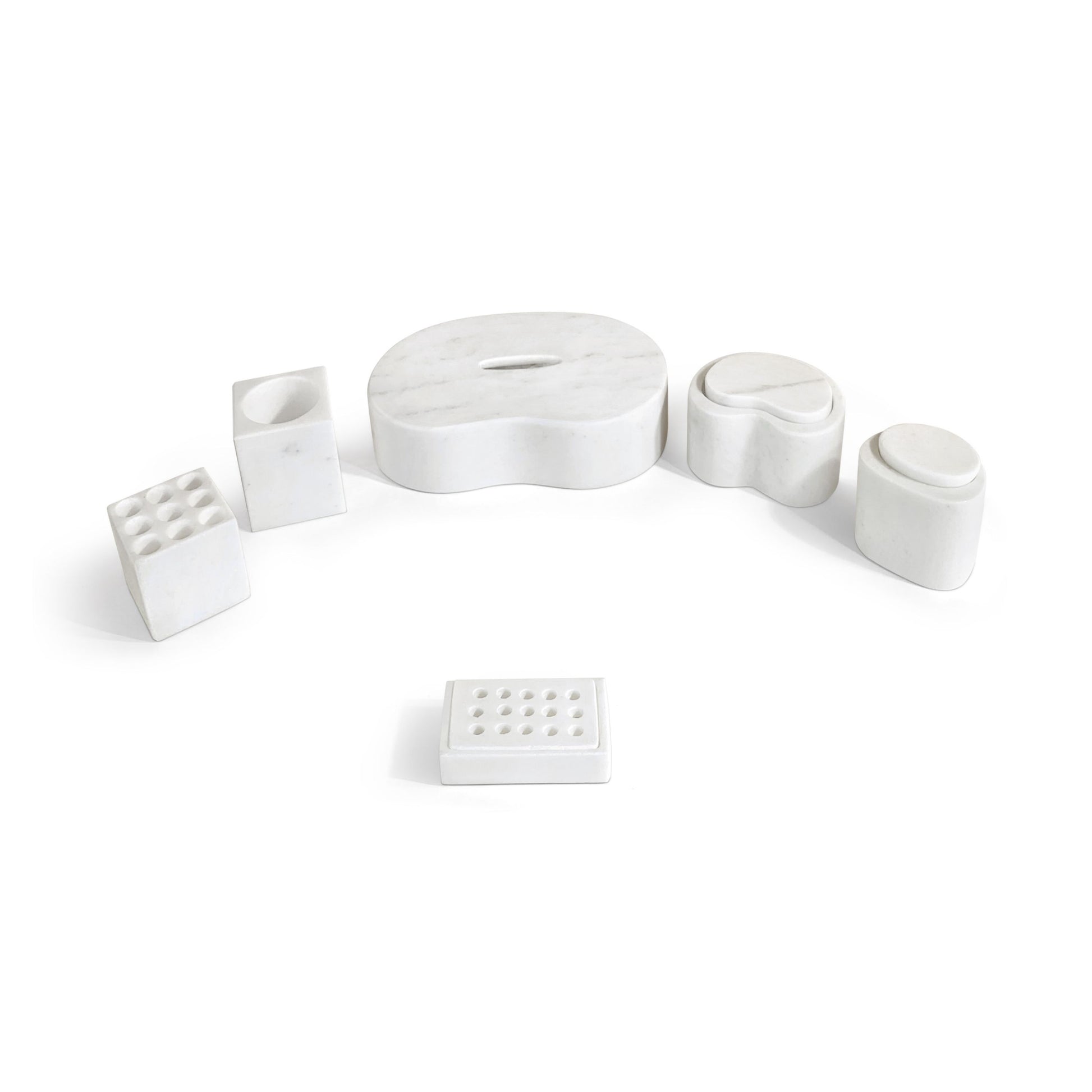 - Elegant 6-Piece Set: Includes a tissue box, soap dish, toothbrush holder, toothbrush tumbler, Design 1# box with lid, and Design 2# box with lid, all crafted from luxurious white natural marble.