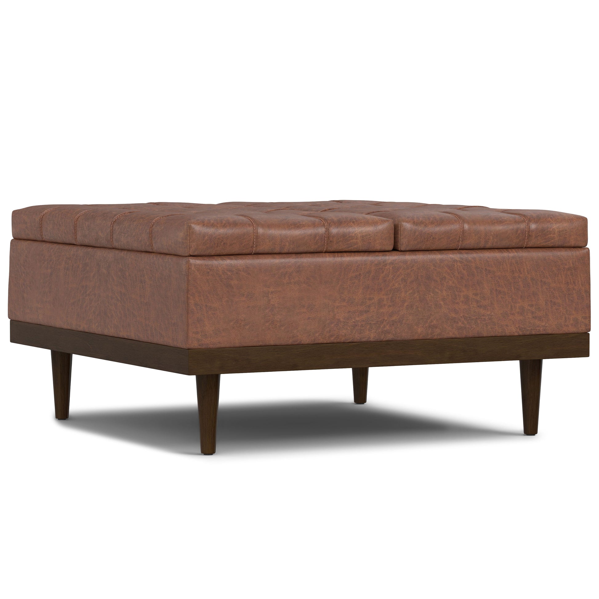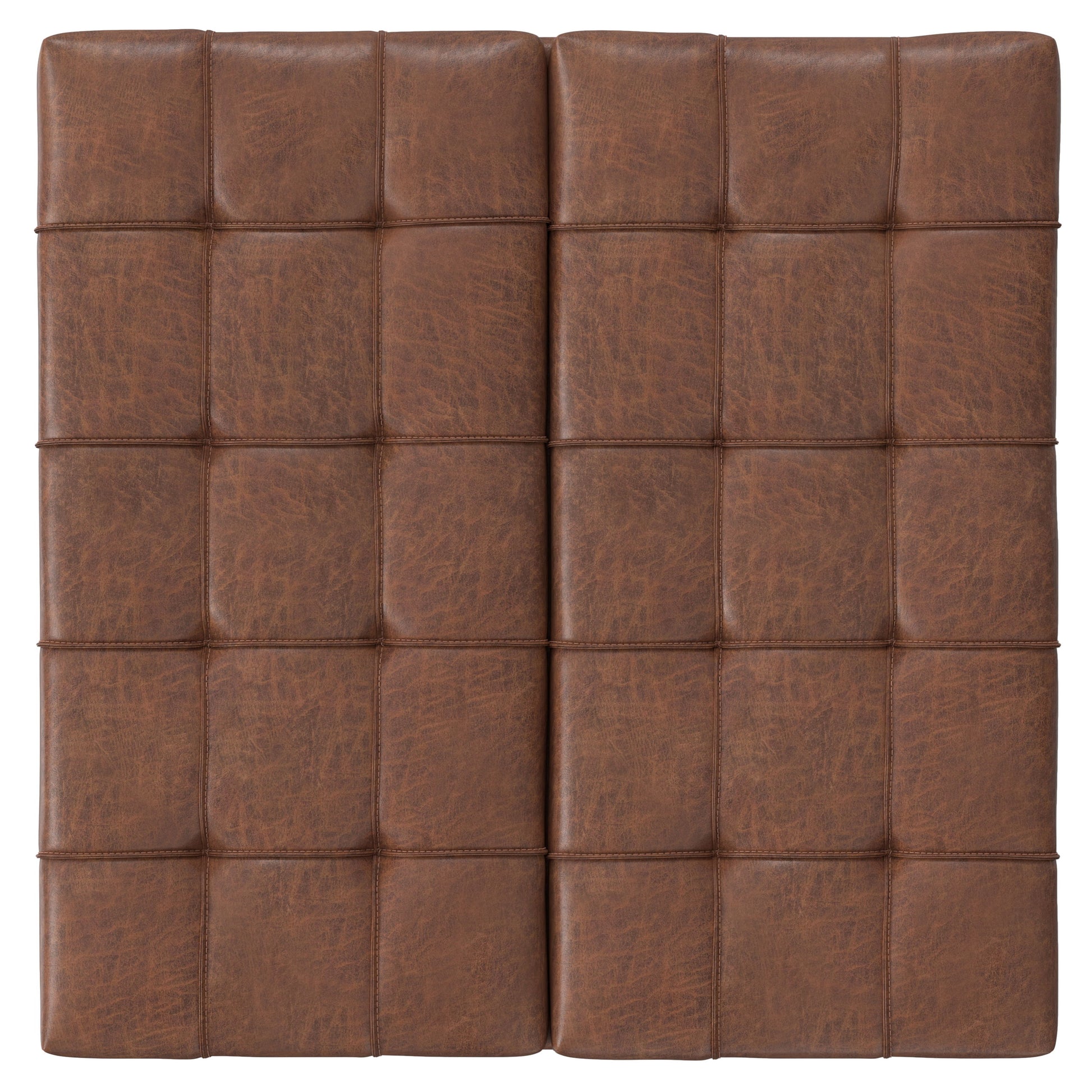- Upholstered in a Distressed Saddle Brown Vegan Faux Leather with tufting and piping detail.