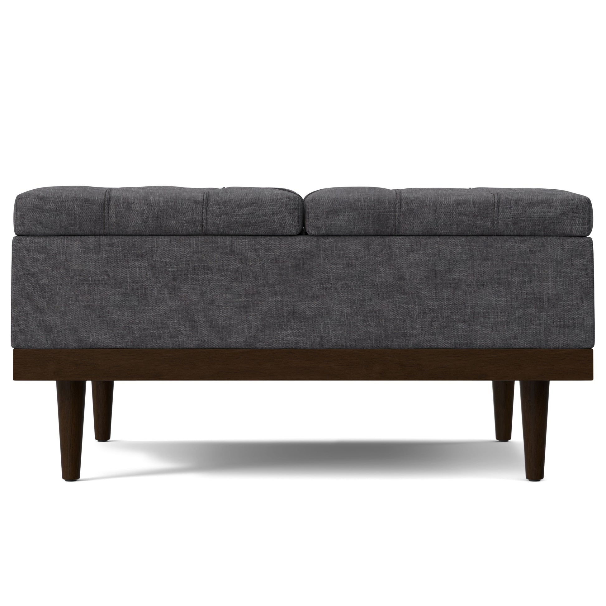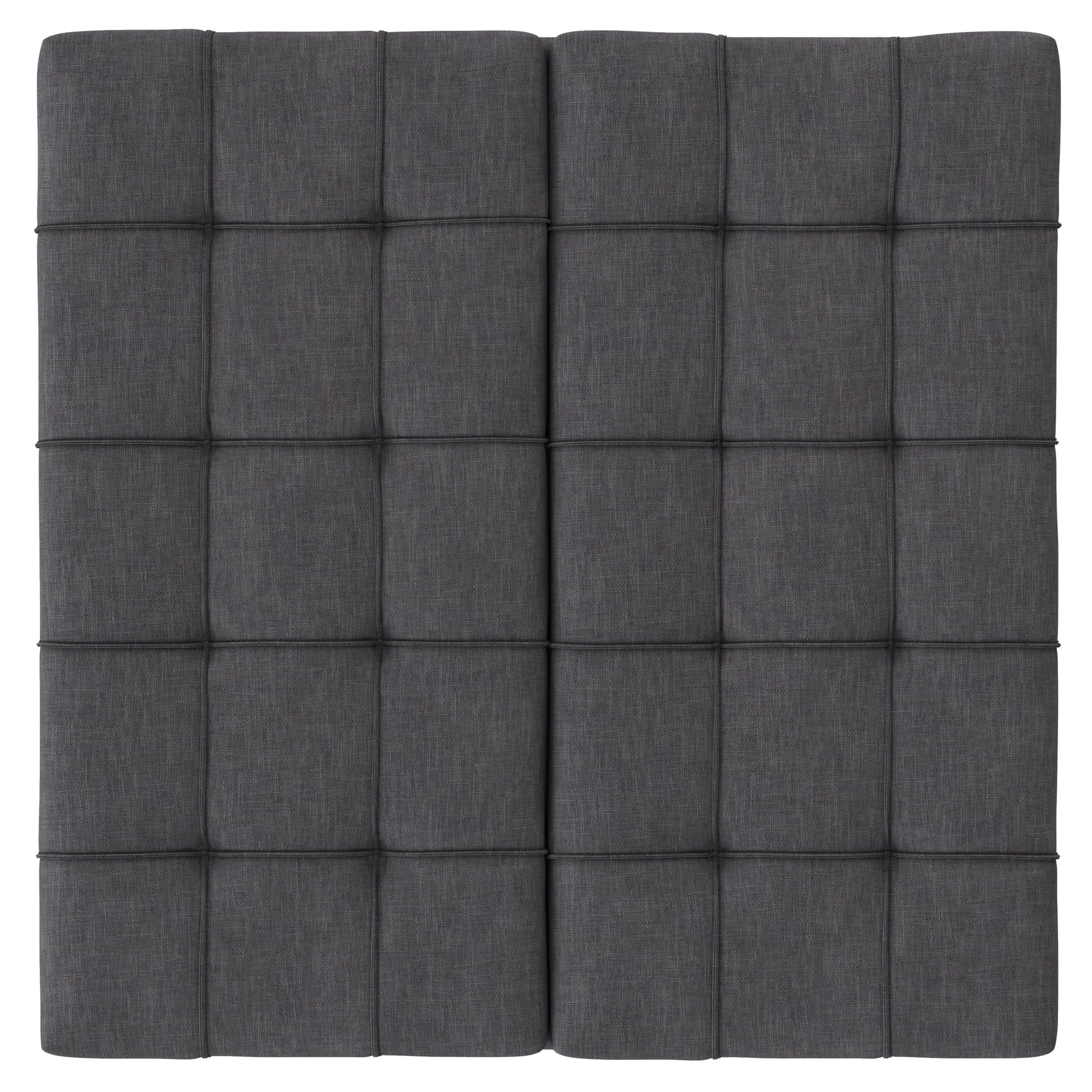 - Upholstered in a durable Slate Grey linen-look fabric with tufting and piping detail.