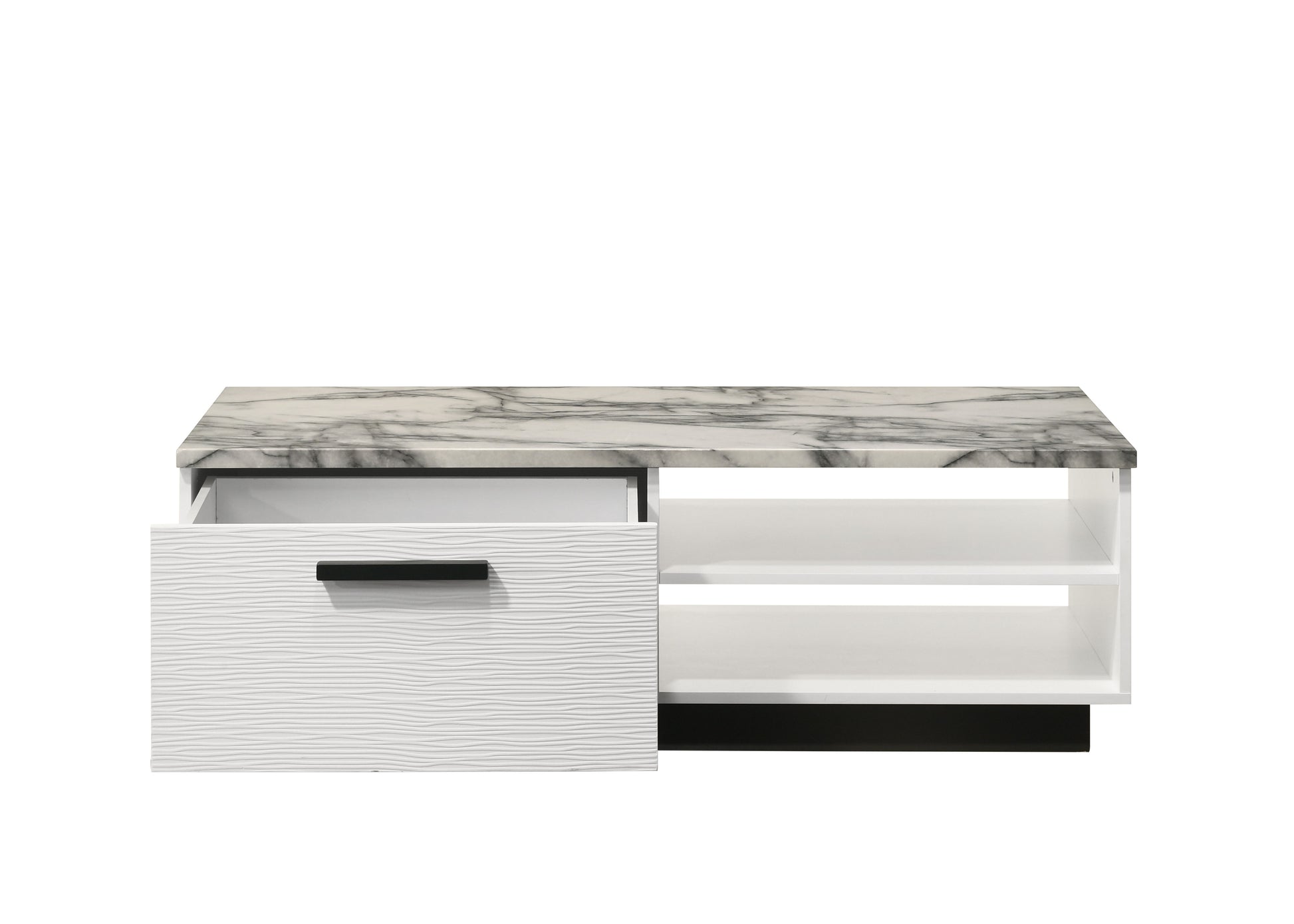 - The Matilda Coffee Table with Faux Marble Top is a masterpiece of modern design that promises to redefine elegance in your living space. Crafted to perfection, the faux marble tabletop of the Matilda exudes luxury and refinement. Each veined detail intricately mimics the natural beauty of genuine marble, elevating the ambiance of any room with its timeless allure. Embrace the art of organization with the Matilda's cleverly concealed drawer, offering a discreet storage solution for your everyday essentials. From remote controls to cherished keepsakes, keep your living space clutter-free without sacrificing style. Whether you're savoring a quiet moment alone or entertaining guests, the Matilda Coffee Table promises to elevate every experience with its unparalleled beauty and functionality.