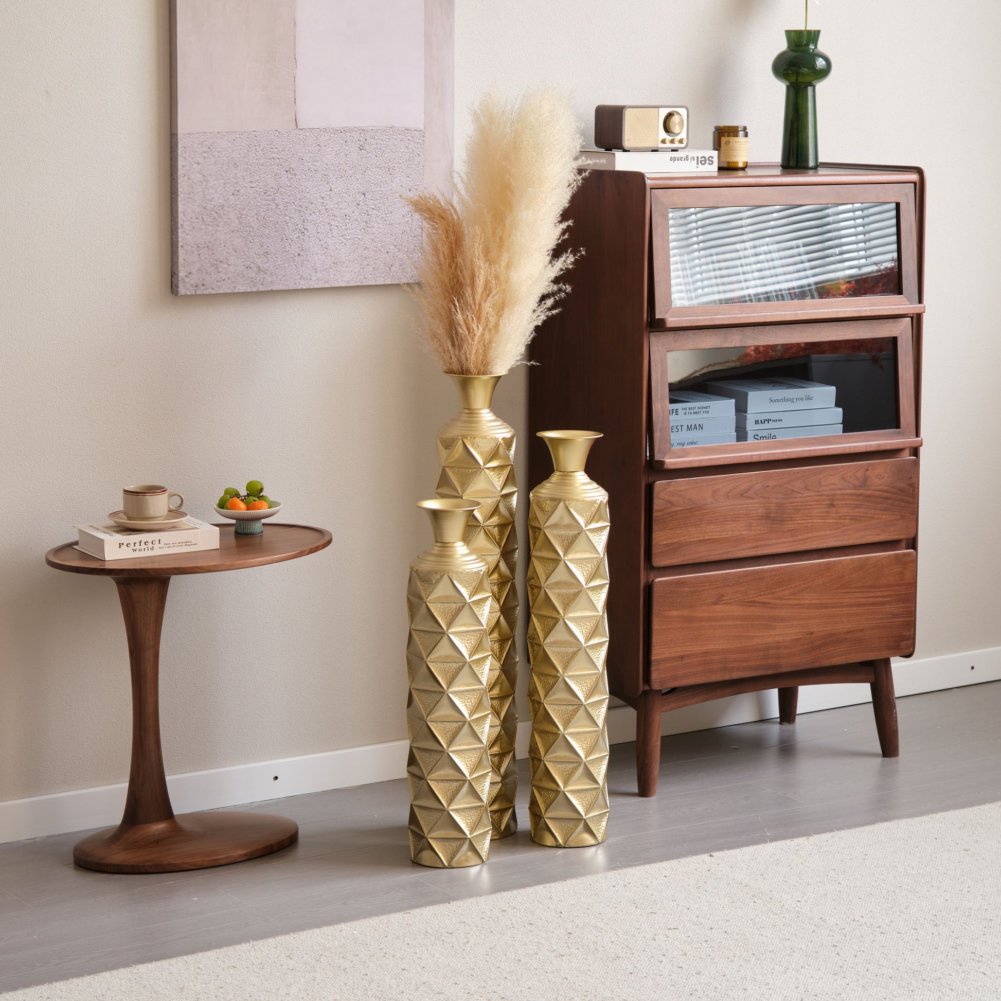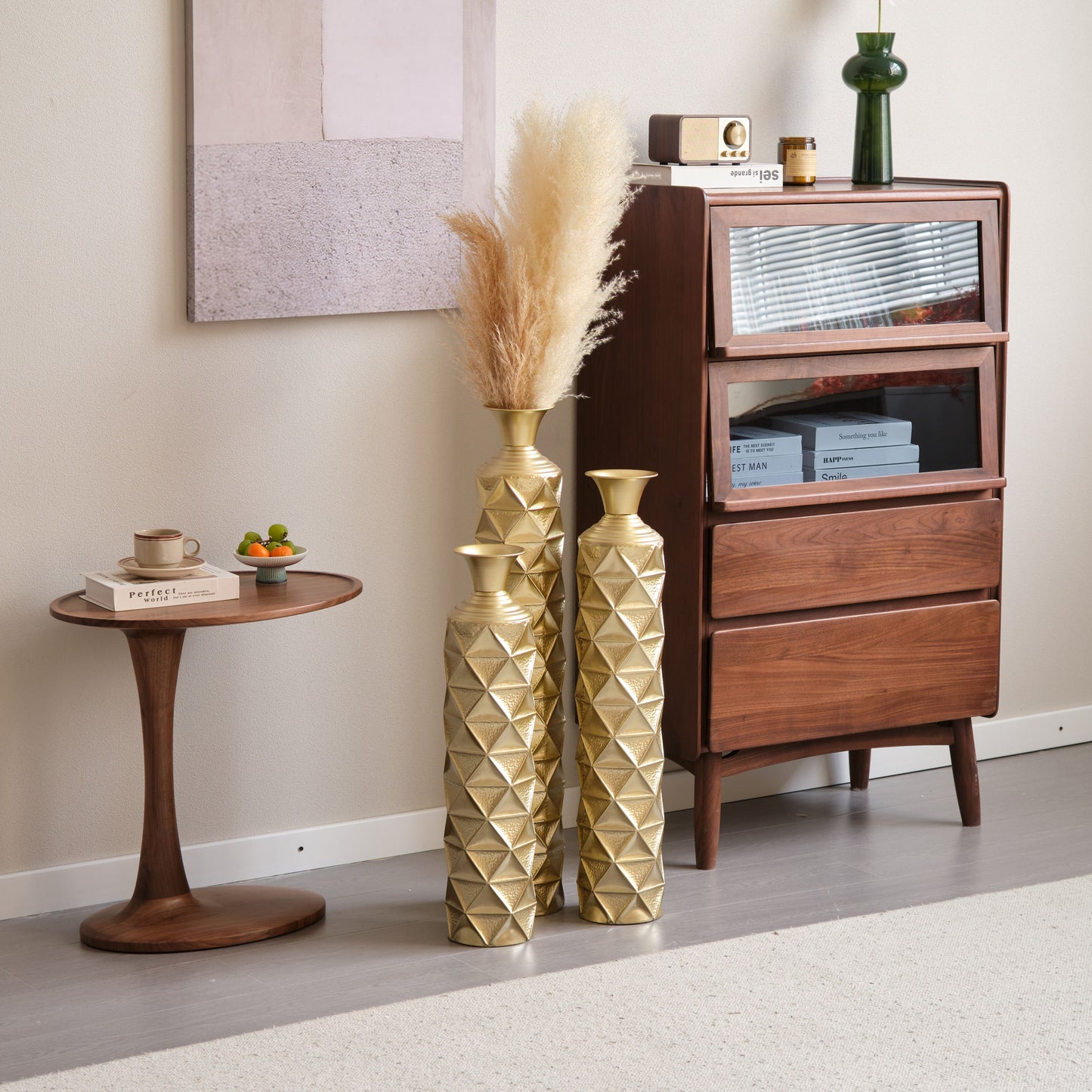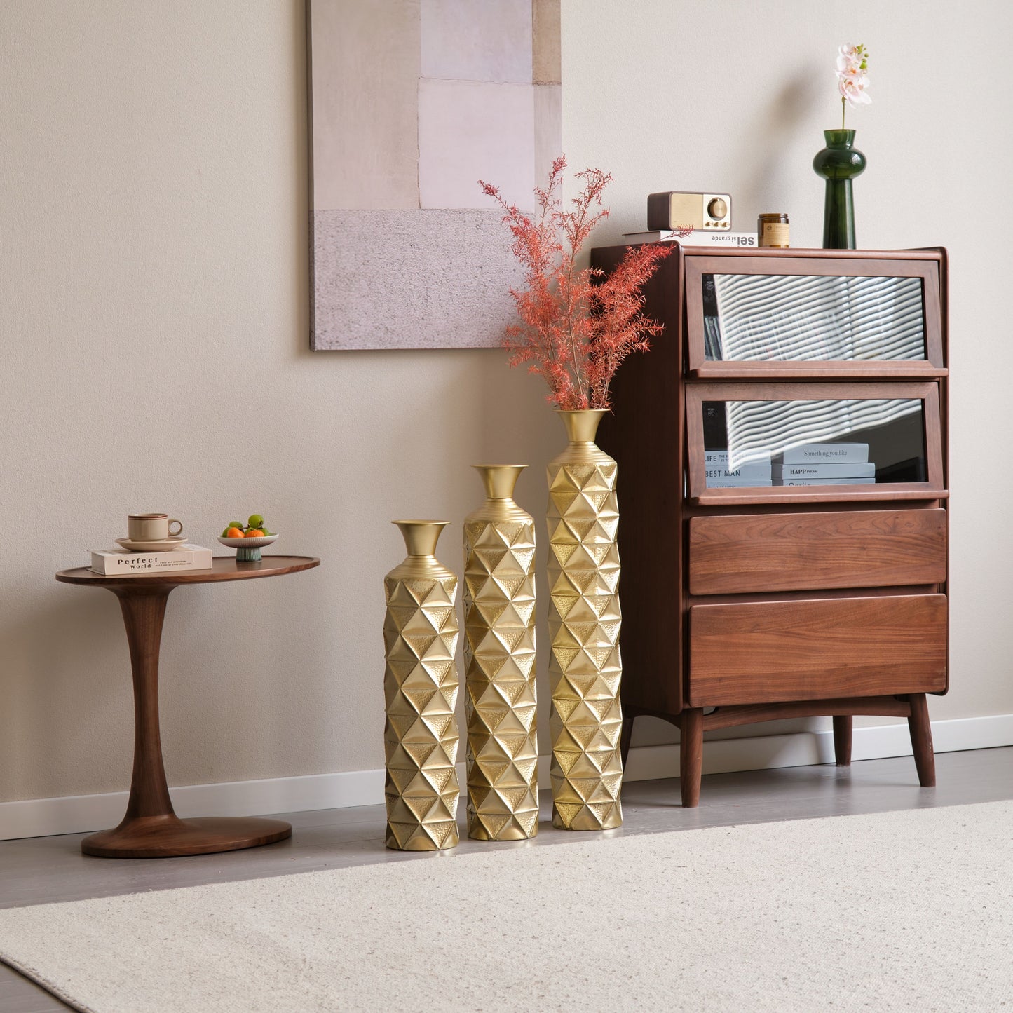 Metal Decorative Vase High Distress Metal Center Vase With 3D Triangle Pattern, (Set of 3) Vases For Home Decoration - Gold