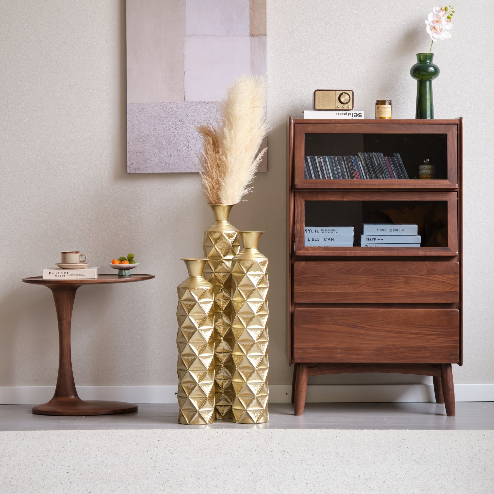 - Geometric Design: Tall and slender with funnel-shaped necks and embossed triangular patterns, these vases bring a modern geometric touch to any décor.