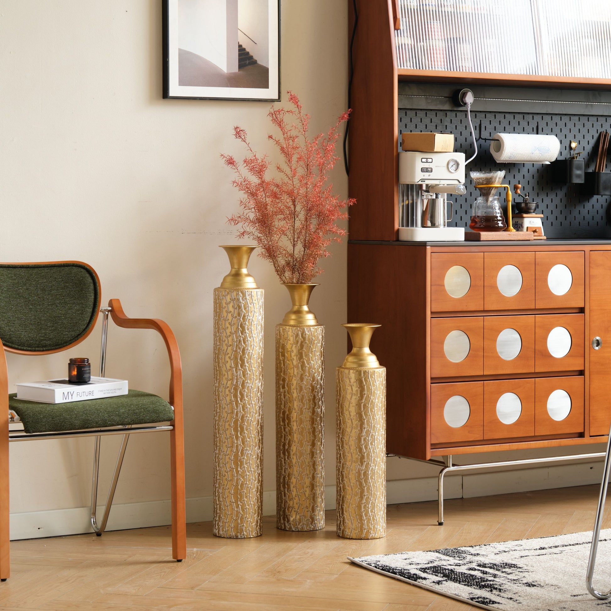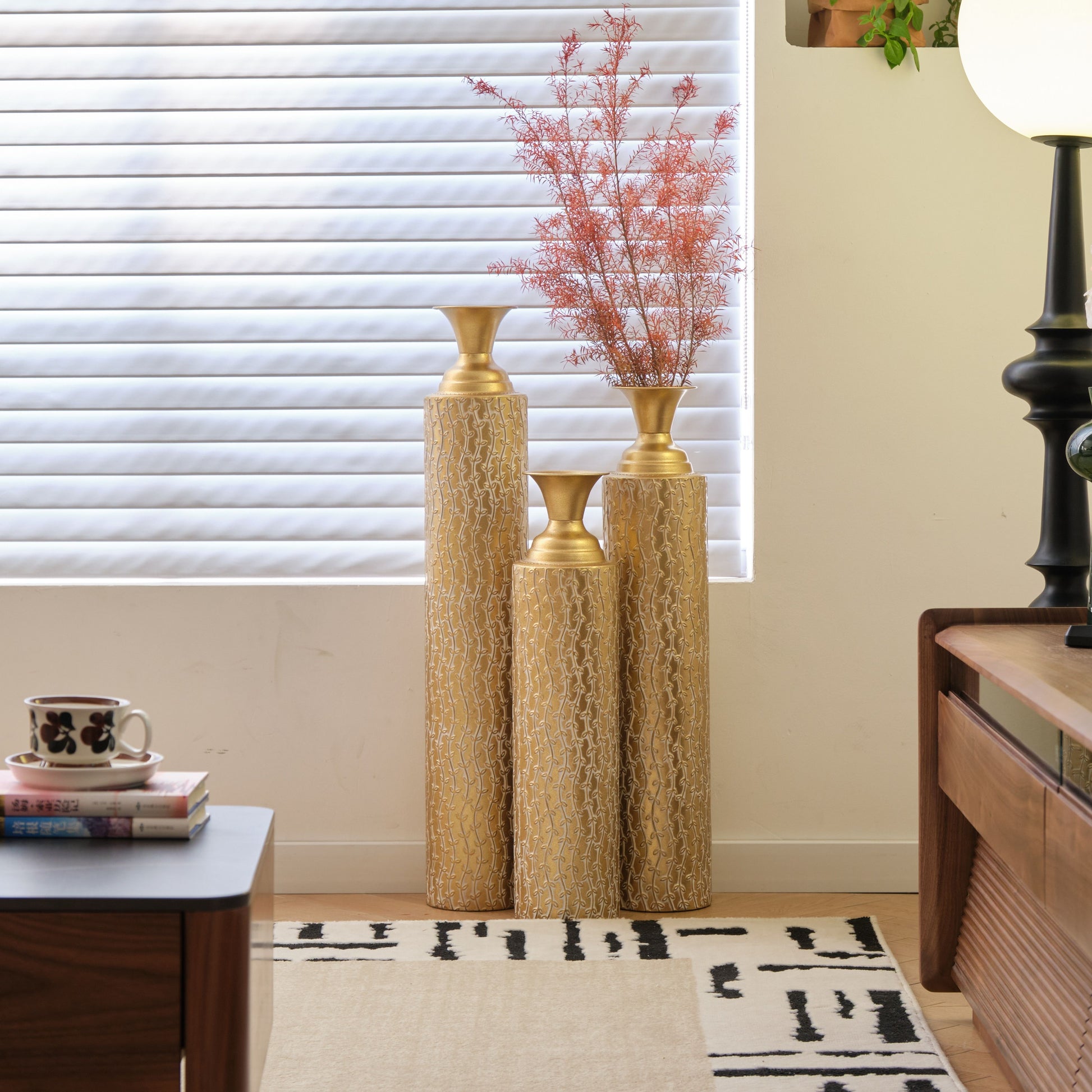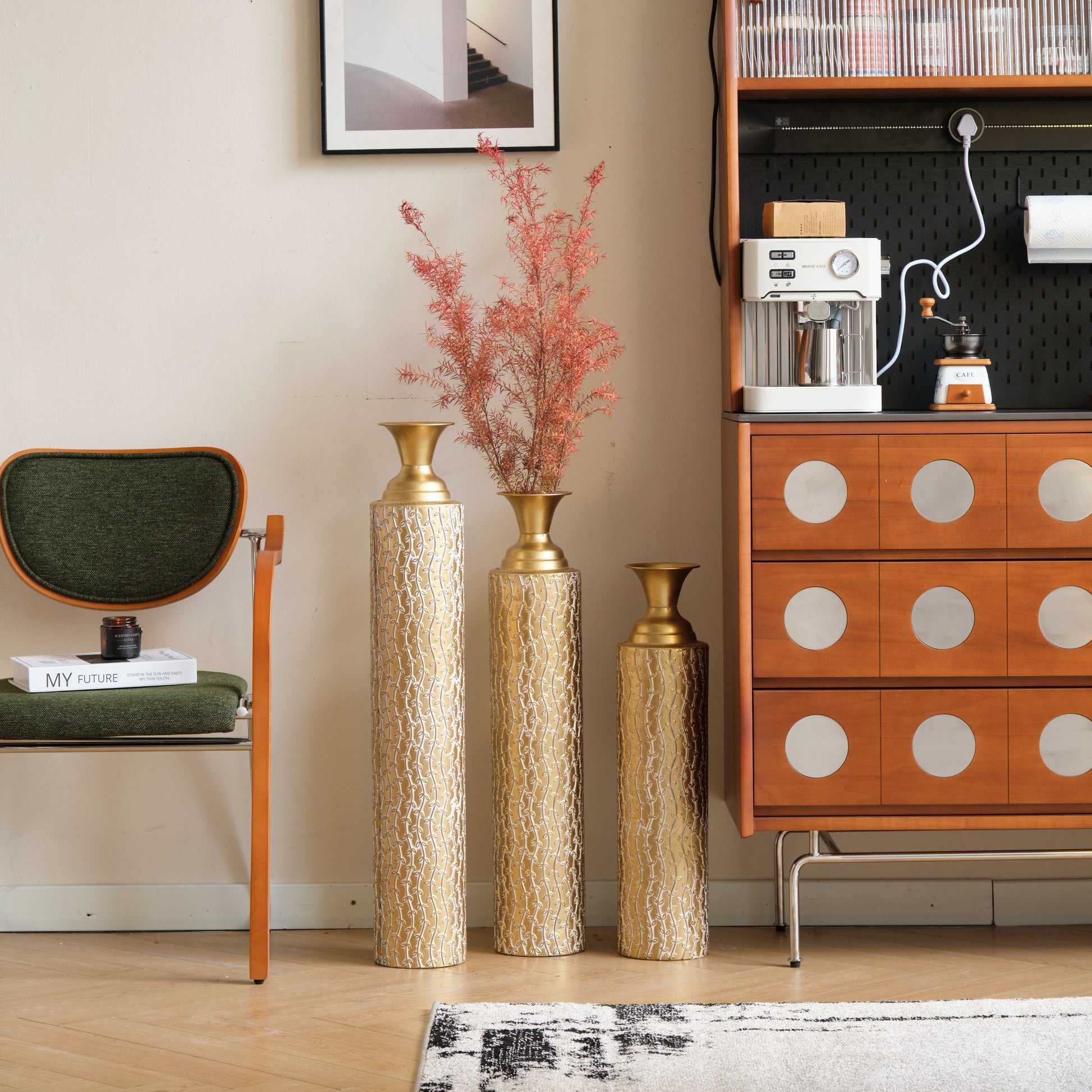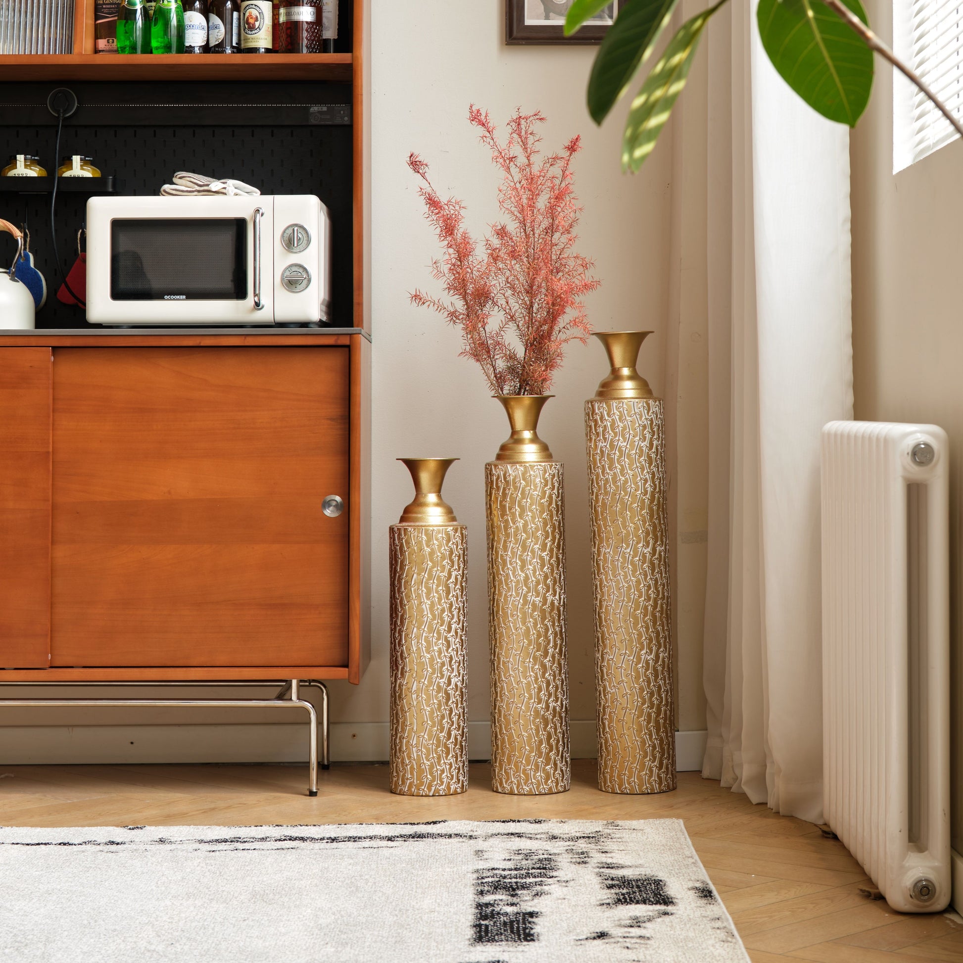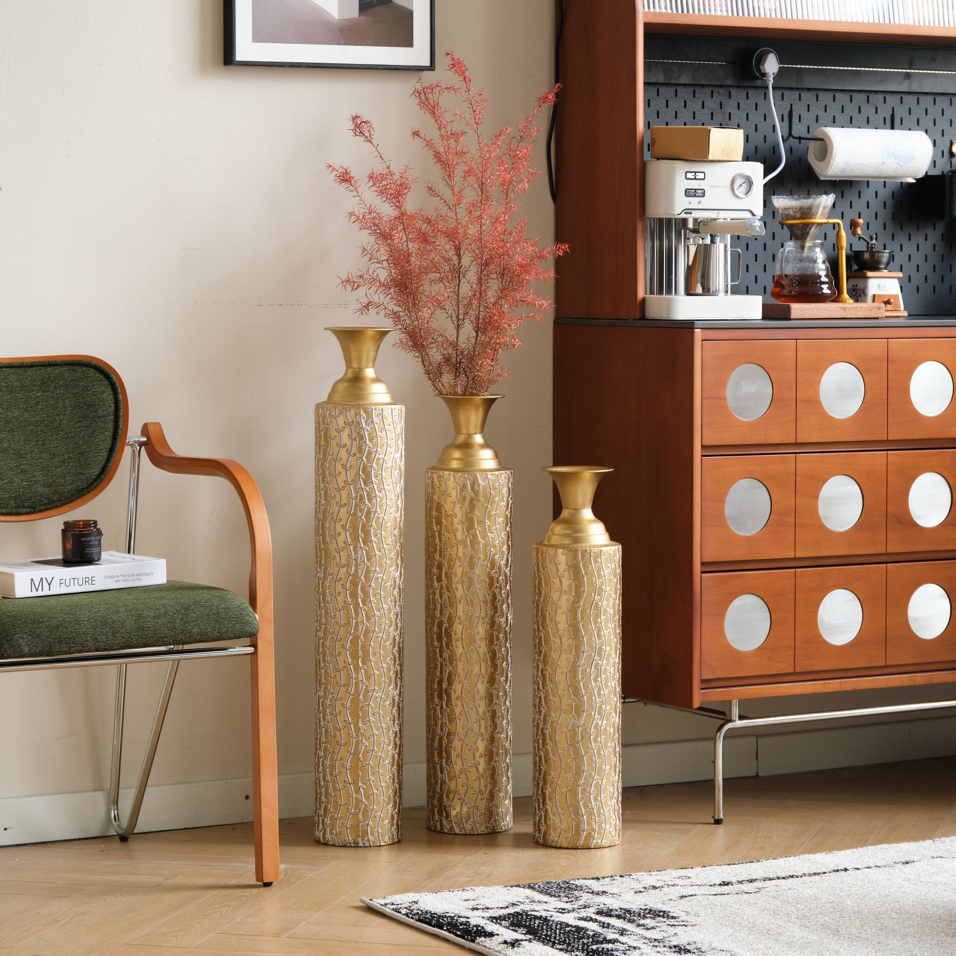 Metal Decorative Vases High Distress Metal Center Vases With Growing Vine Patterns, (Set of 3) Vases For Home Decoration - Gold