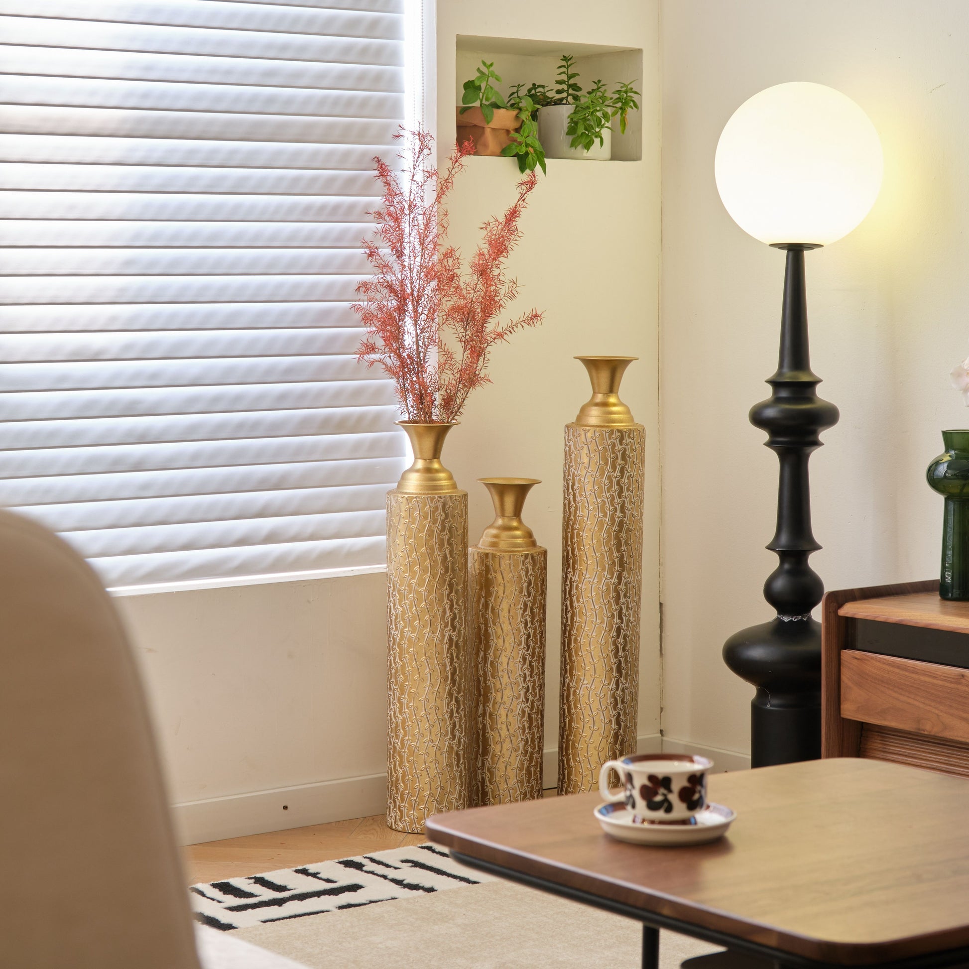 - Gold Vases for Decoration: The round home décor vases set features a polished gold finish with a distressed metallic look.