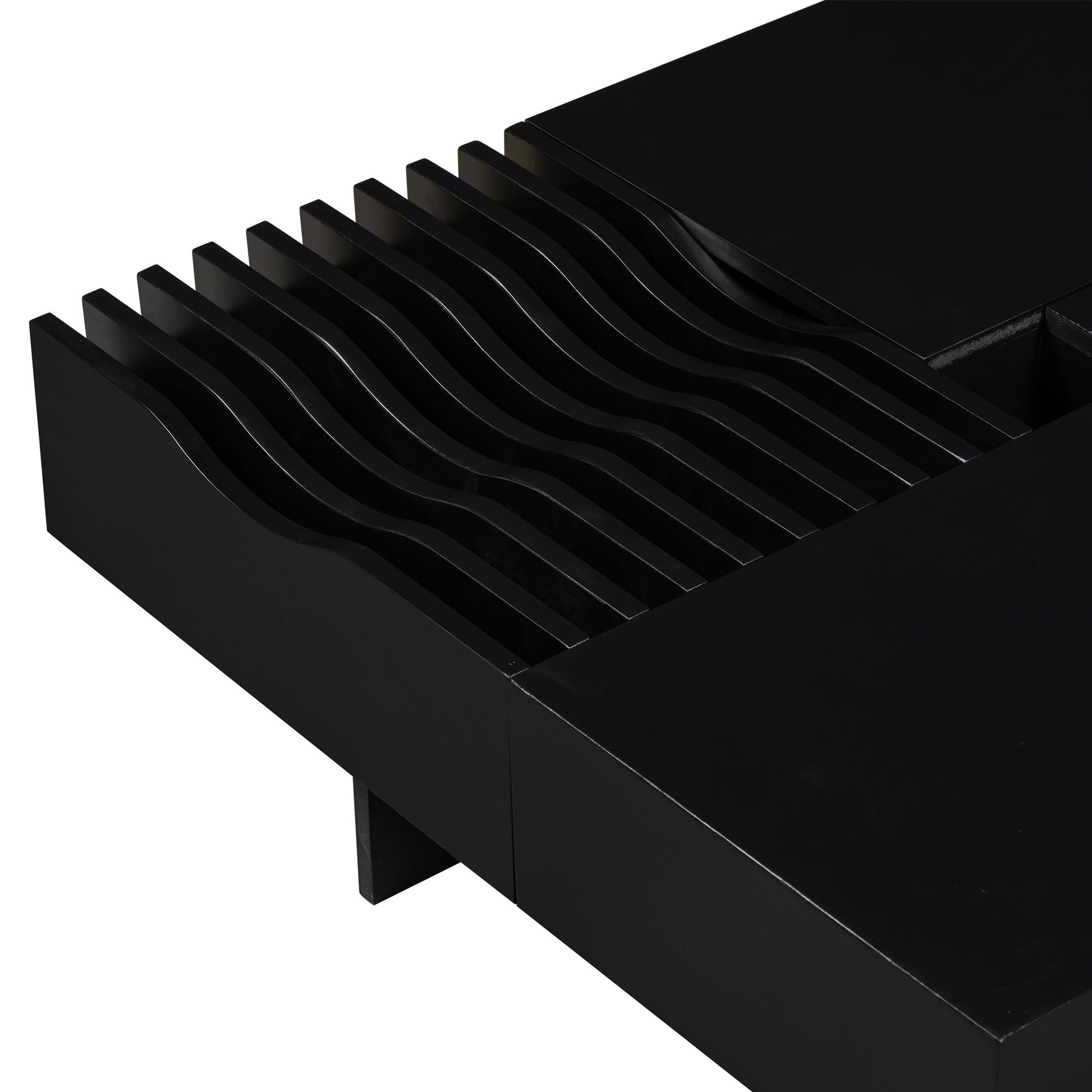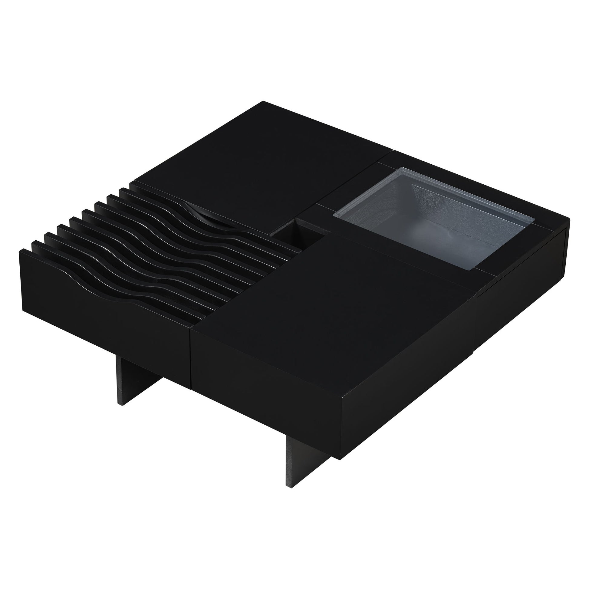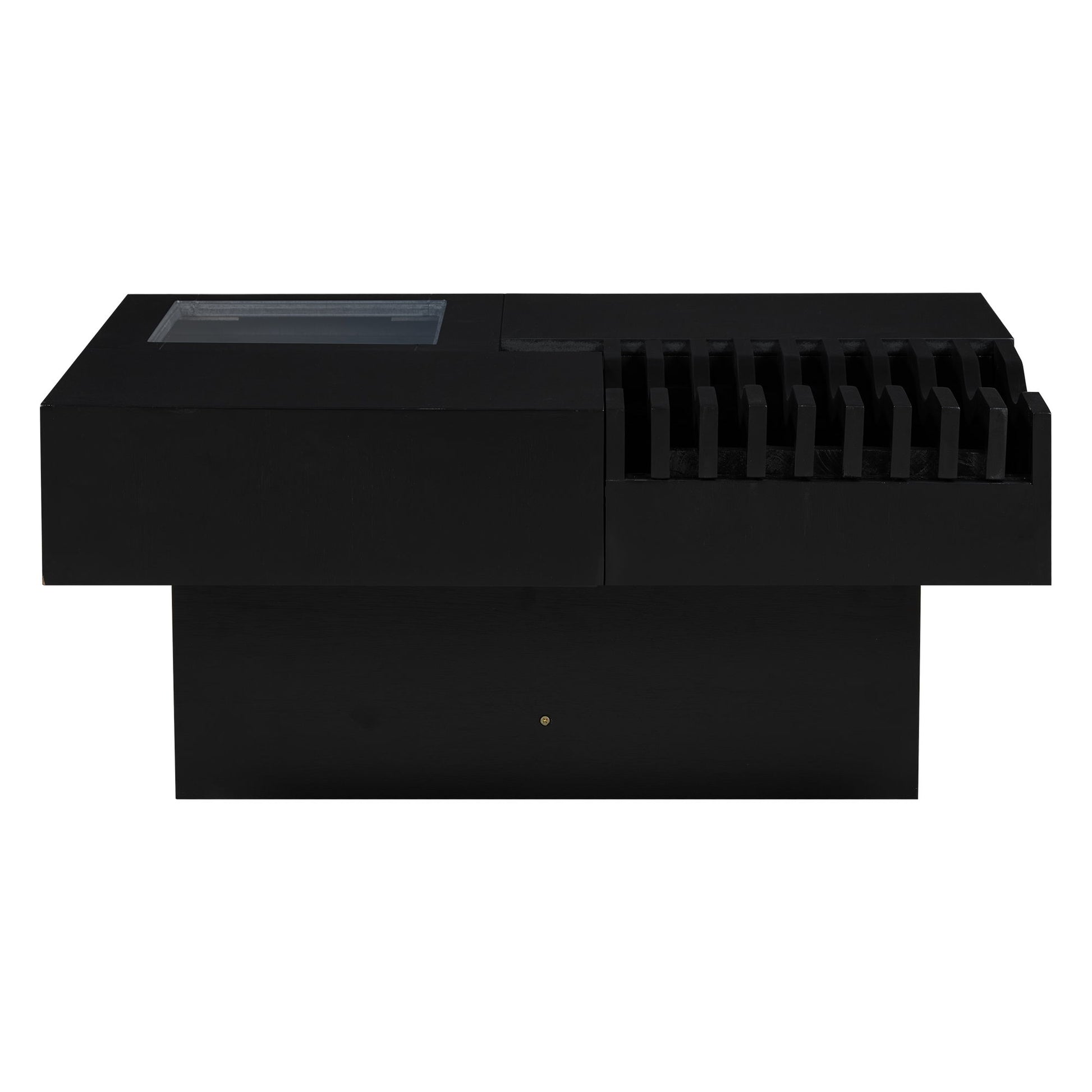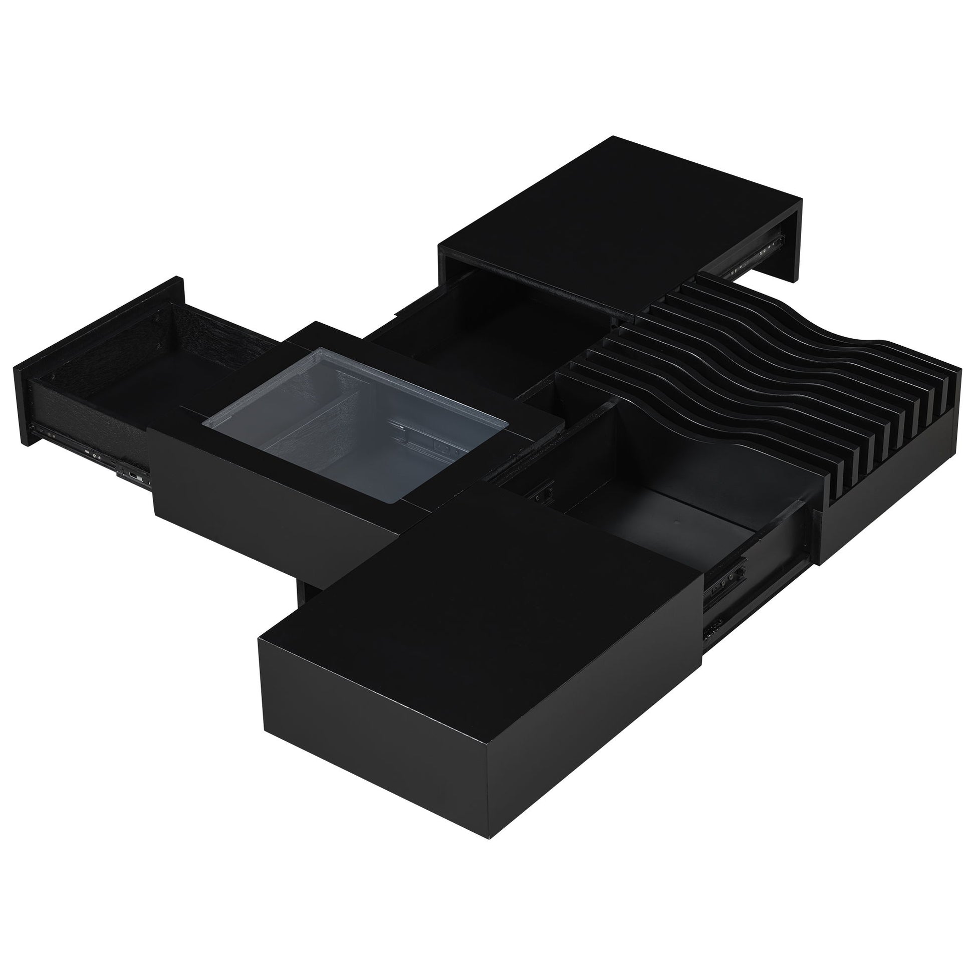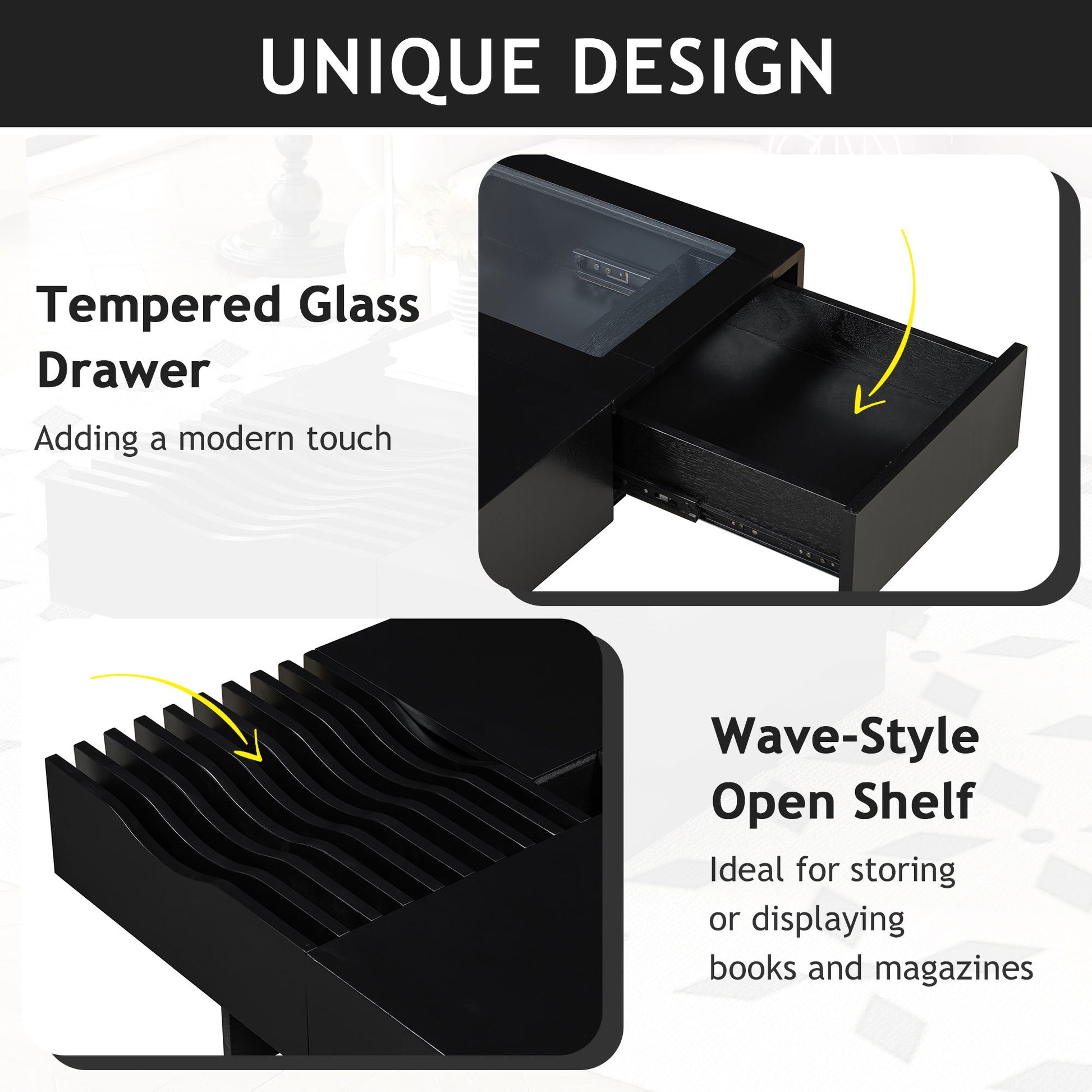 Mid Century Modern Coffee Table, Unique Square Wooden Coffee Table With 3 Drawers, Tempered Glass And Solid Wood Legs For Living Room - Black
