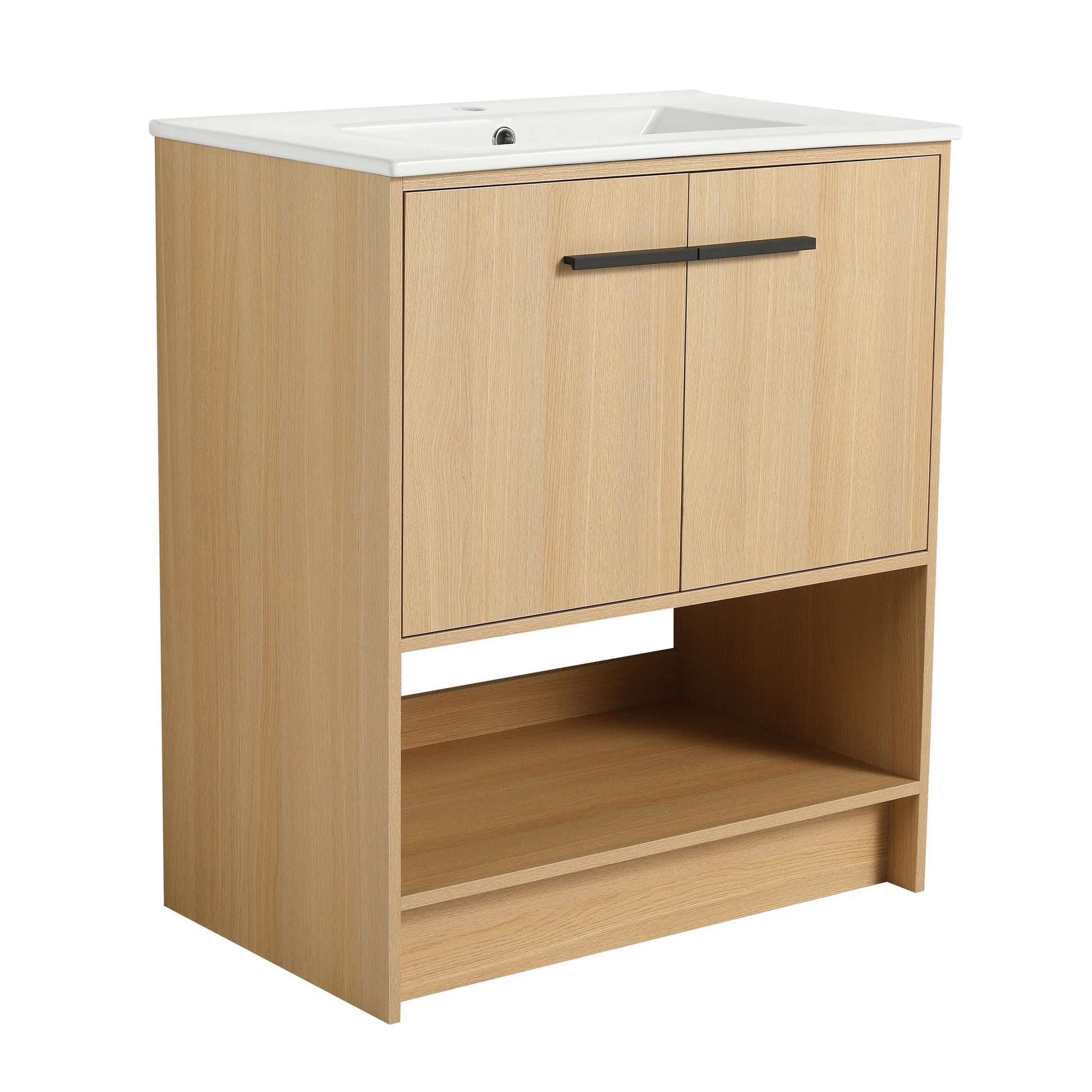 Modern 30" Bathroom Vanity With Ceramic Sink, Freestanding Cabinet, 2 Soft Closing Doors - Oak