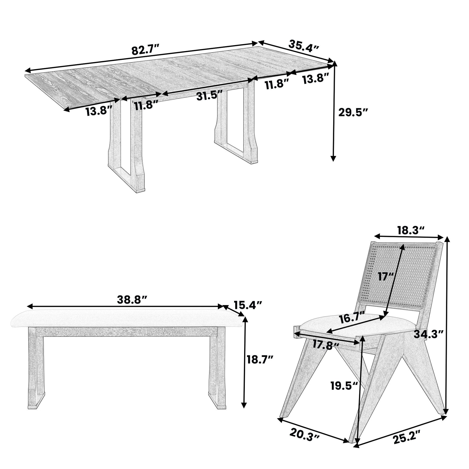 Modern 6 Piece Extendable Dining Table Set With 4 Wicker Back Upholstered Dining Chairs And Long Bench, 2 Removable Leaf - Walnut