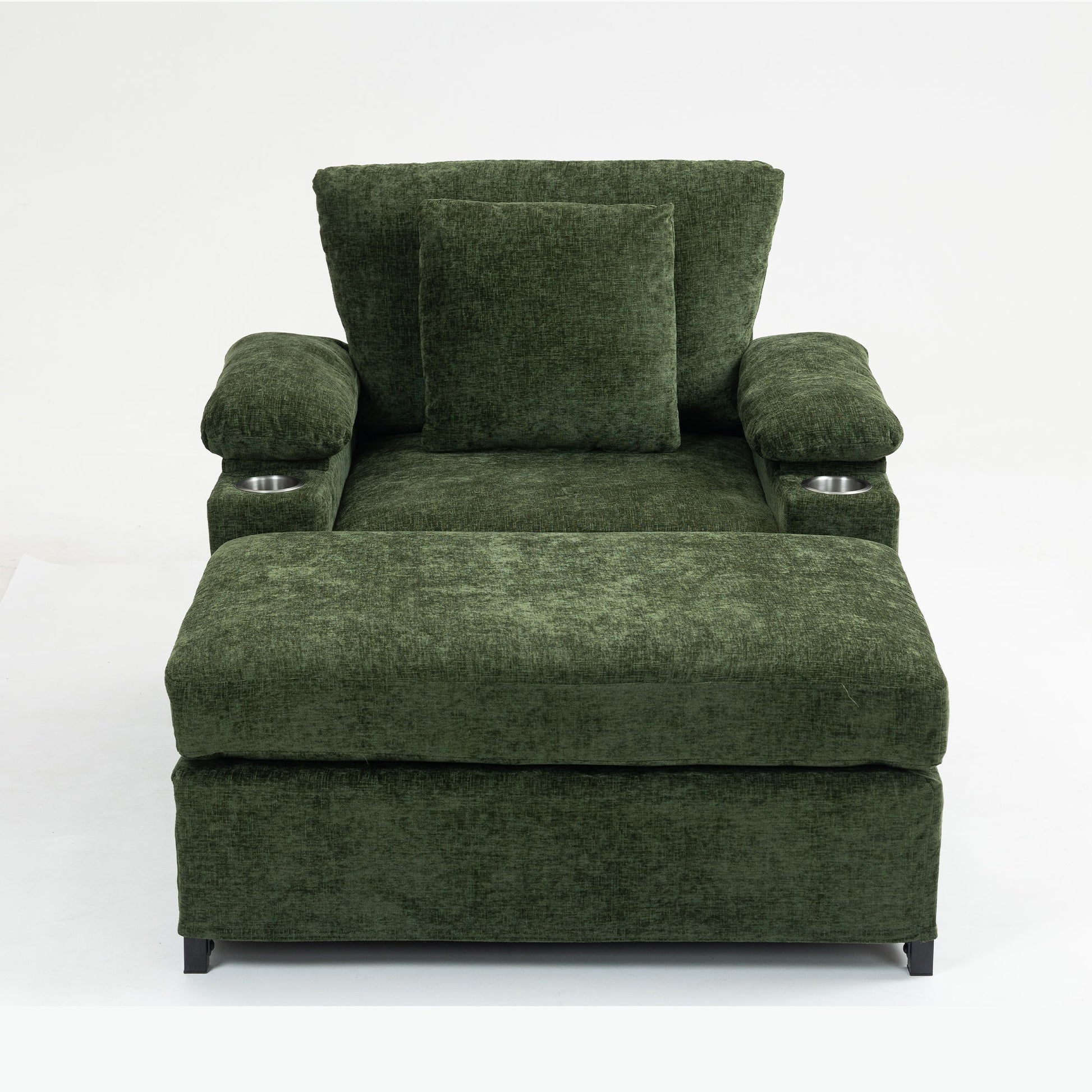 Modern Oversized Chair With Ottoman, Chenille Fabric Sofa Bed, Accent Chair Comfy Sofa With Cupholders And USB Charging Ports Chair For Living Room, Bedroom, Apartment - Green