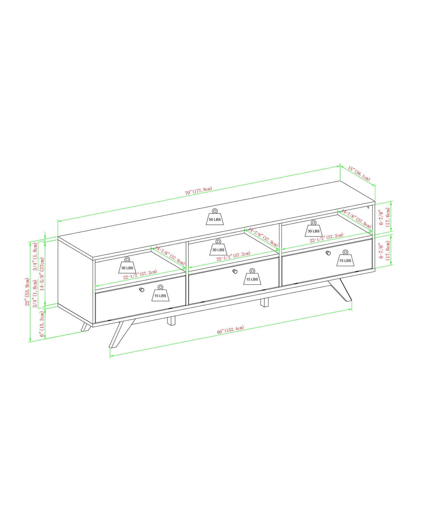 - 3 faux drawer fronts with hinged, drop-down doors